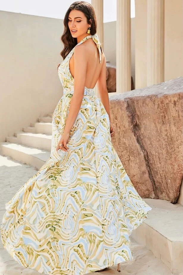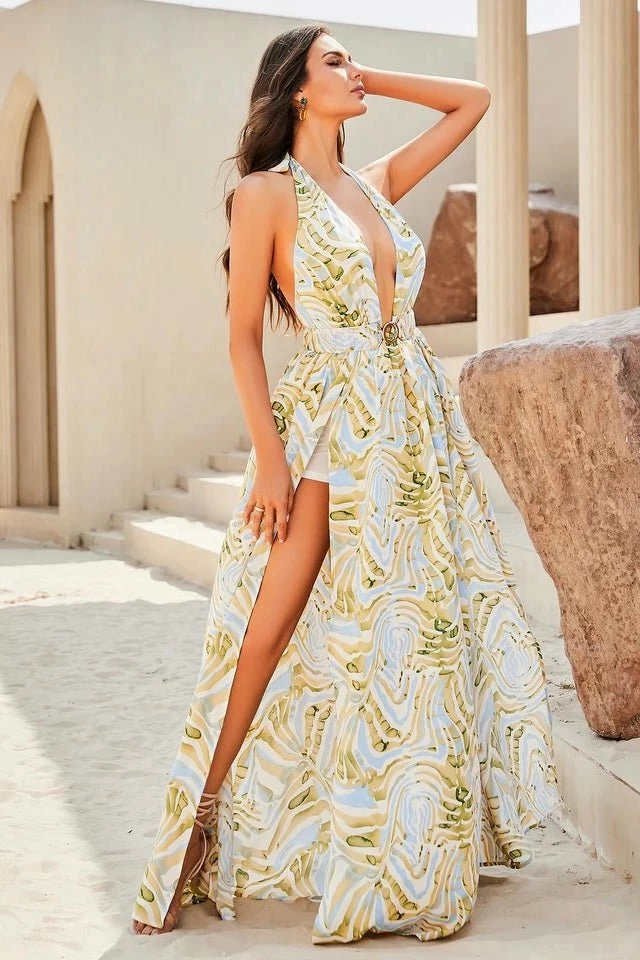 Make a bold statement in this floor sweeping maxi dress. The stunning maxi features a center front ring, a halter neck and double leg slits. Style with gold hoops and strappy heels for a chic day or night look.
