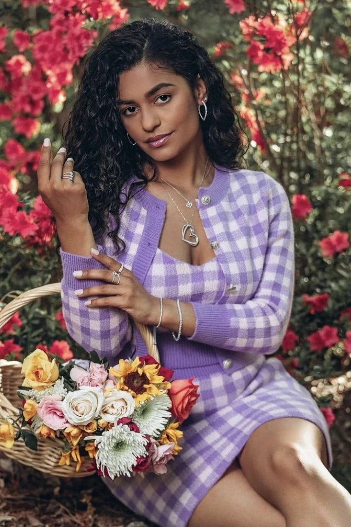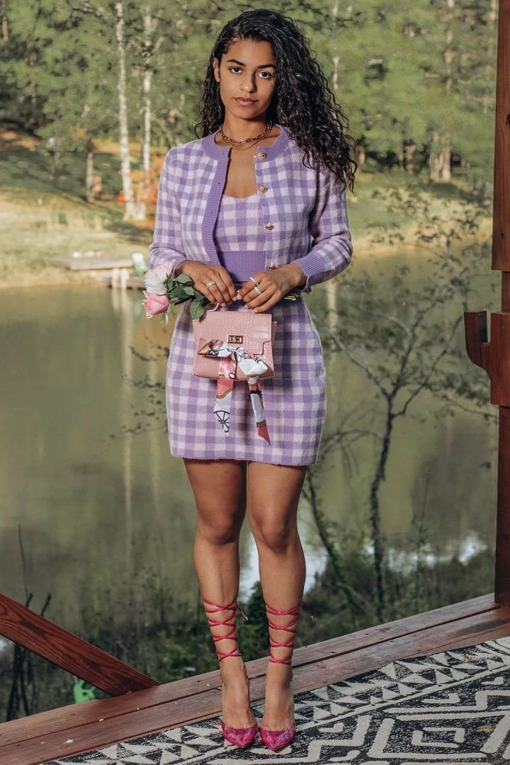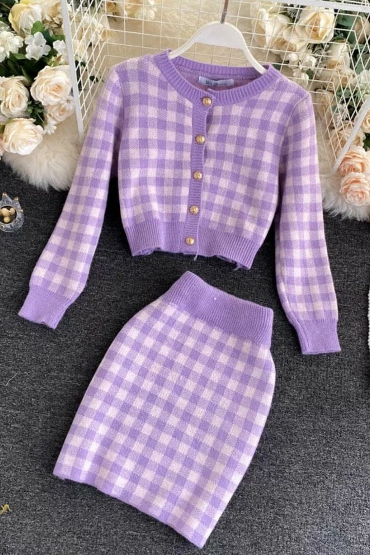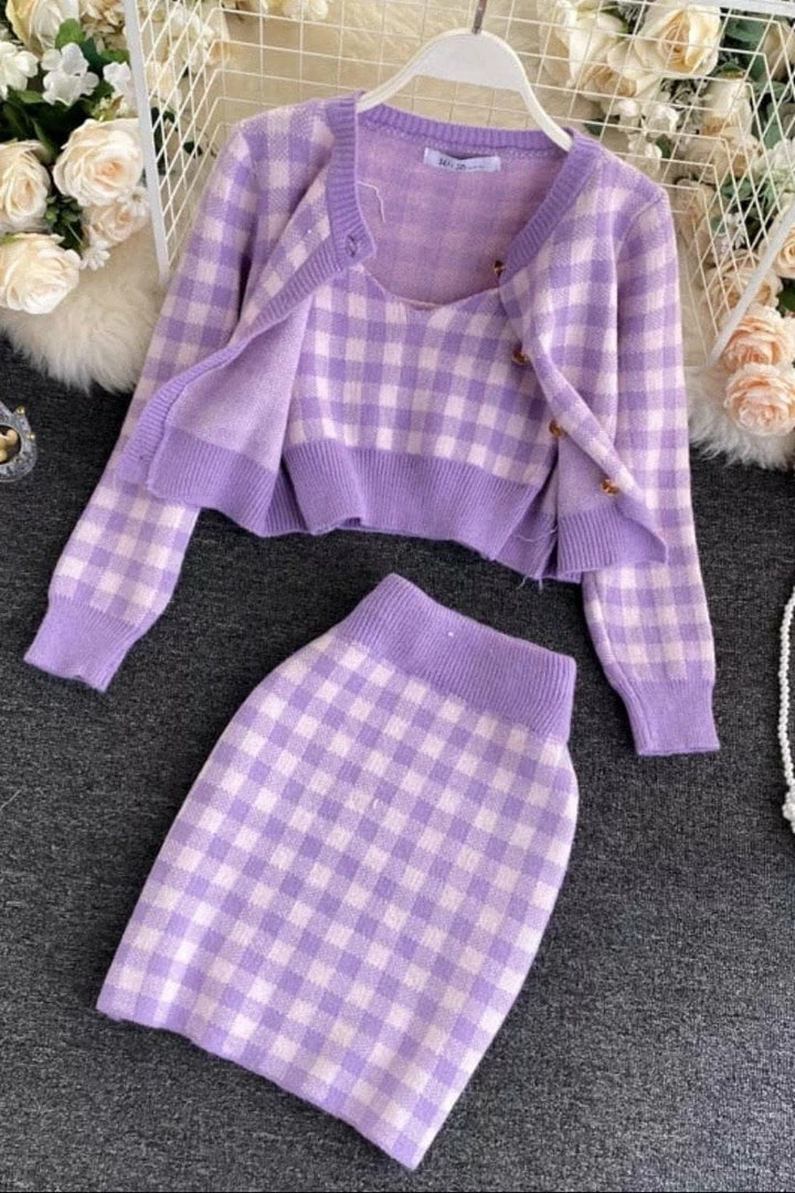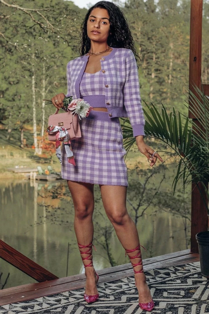 This super cute set includes a houndstooth material, cropped tank top, long sleeve cardigan, and mini skirt. Pair with nude pumps and a mini handbag for a stunning look!