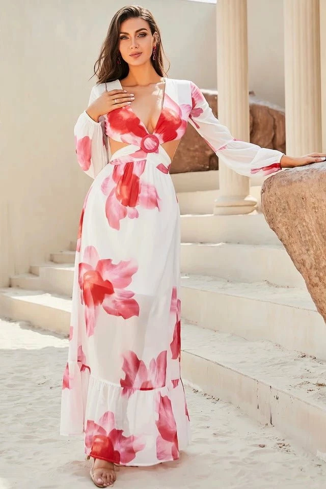 Take sunny days to new lengths in this gorgeous maxi. The Jeana maxi features a stunning floral print, front cut outs, an open back with an adjustable tie and long puffy sleeves.
