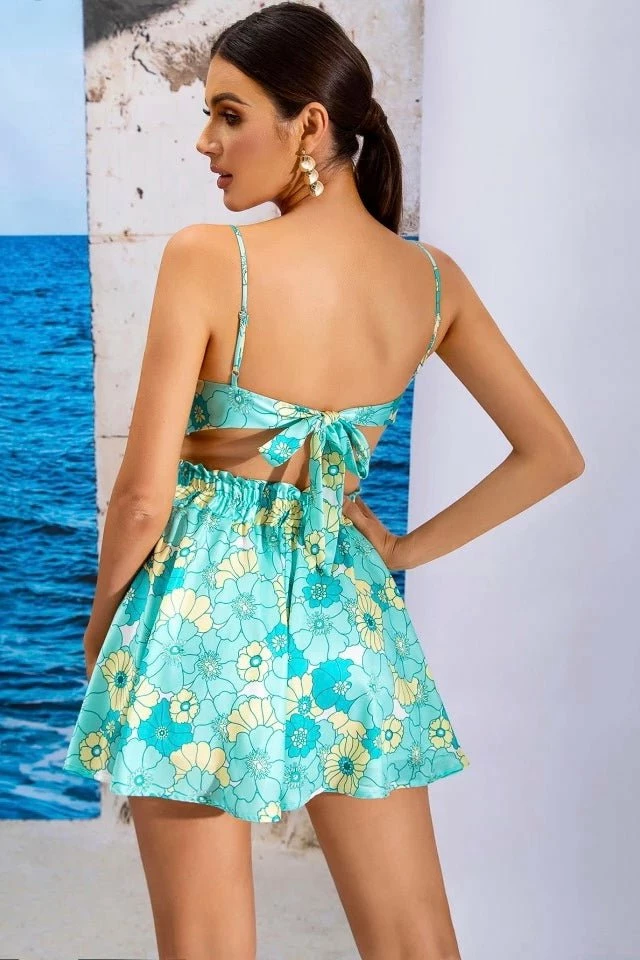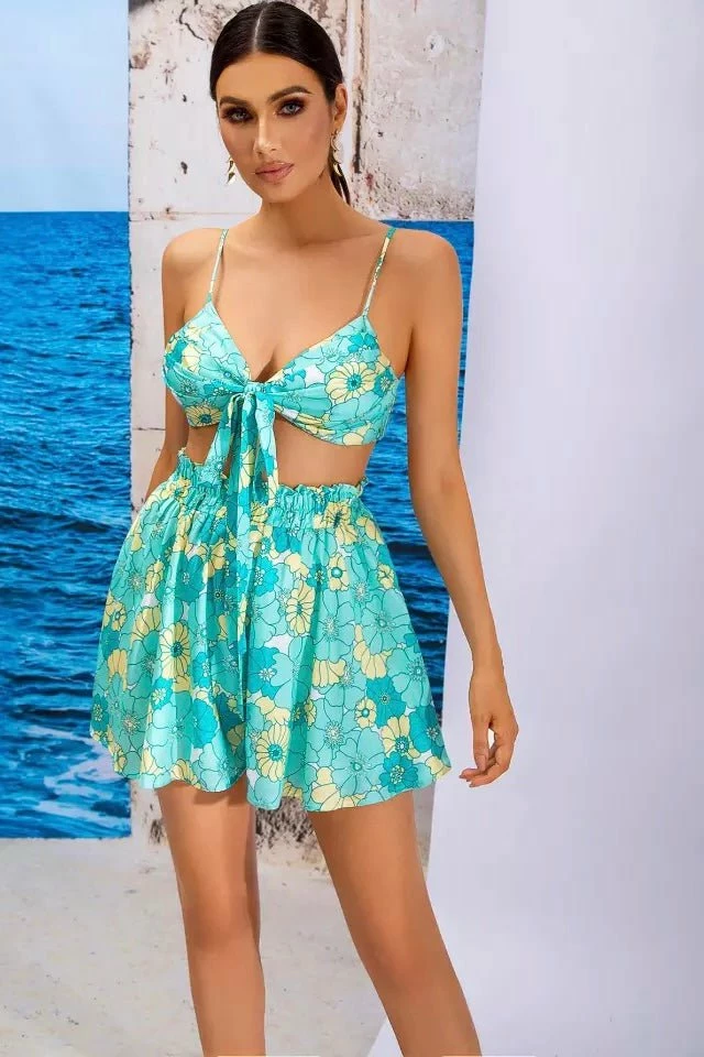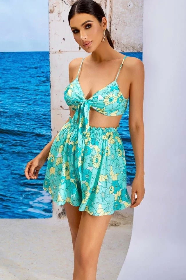 All eyes on you in this short set! Features an adjustable tie spaghetti strap crop top with flowy shorts. Pair with chunky wedges and a cute tote.