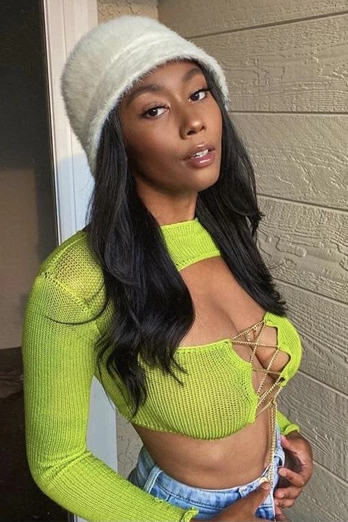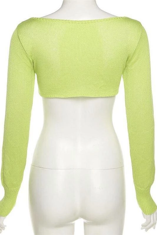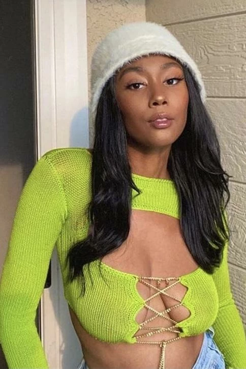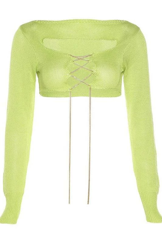Stay trendy during the chilly season with this with this knitted, long sleeve, cut out crop top with gold chain lace up detailing. Pair with light wash, ripped jeans and a bomber jacket for the ultimate look.
