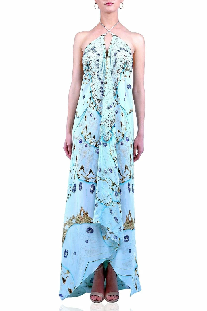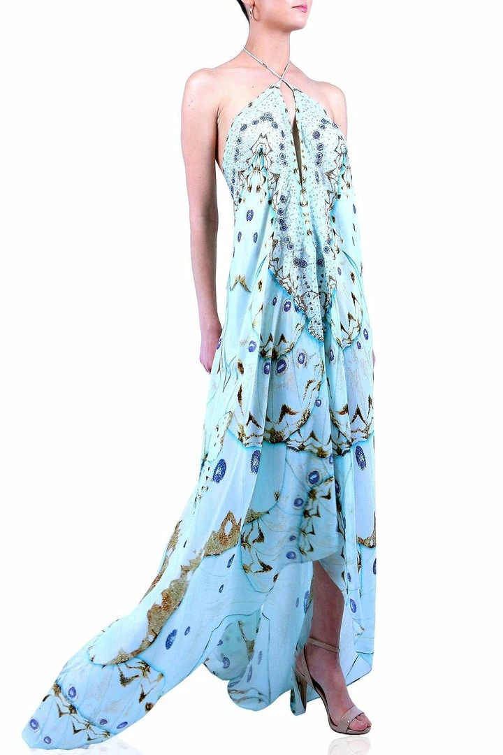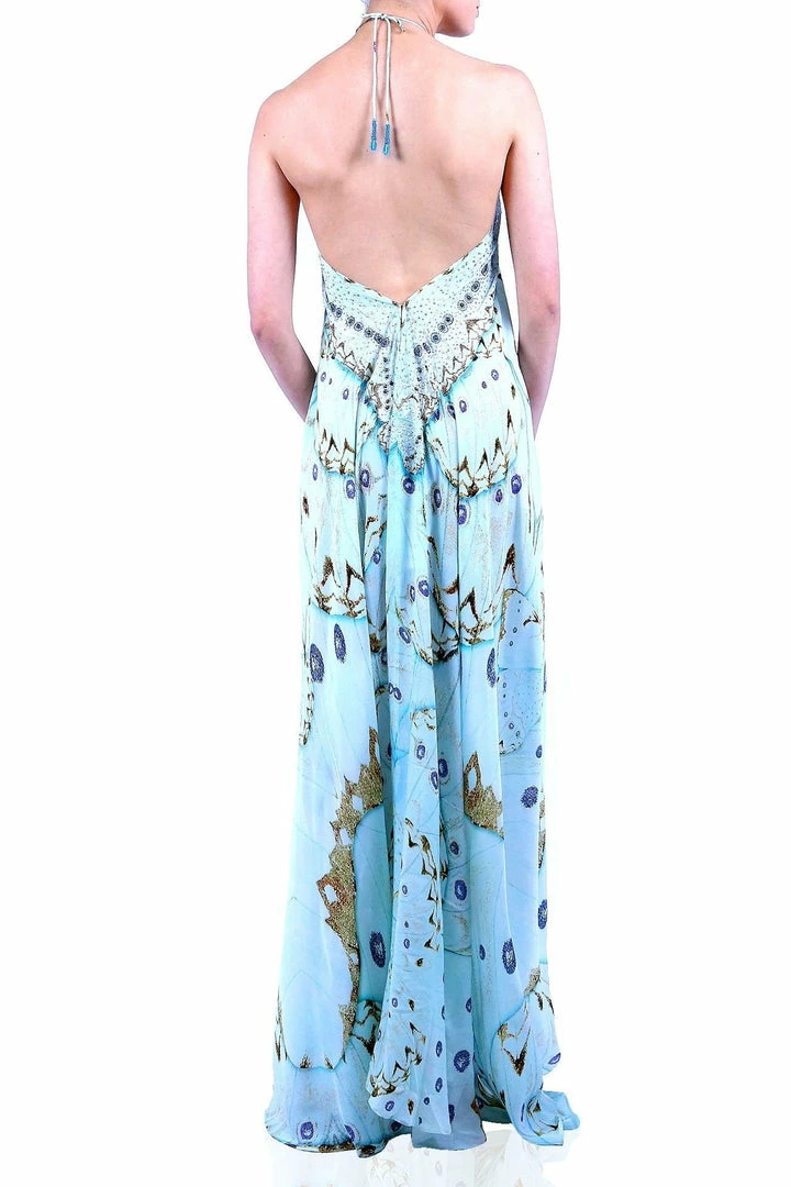 One Dress 3 Ways to Style – Can be converted to front crisscross halter-neck, one-shoulder, or deep v-neck with all backless look – Plunging halter v-neck with front adjustable hook-and-eye clasp closure and self-tie at neck – Sleeveless – Low back with hook-and-eye clasp closure to adjust coverage – Removable waist tie fabric belt – Allover mixed print – Designed in USA
