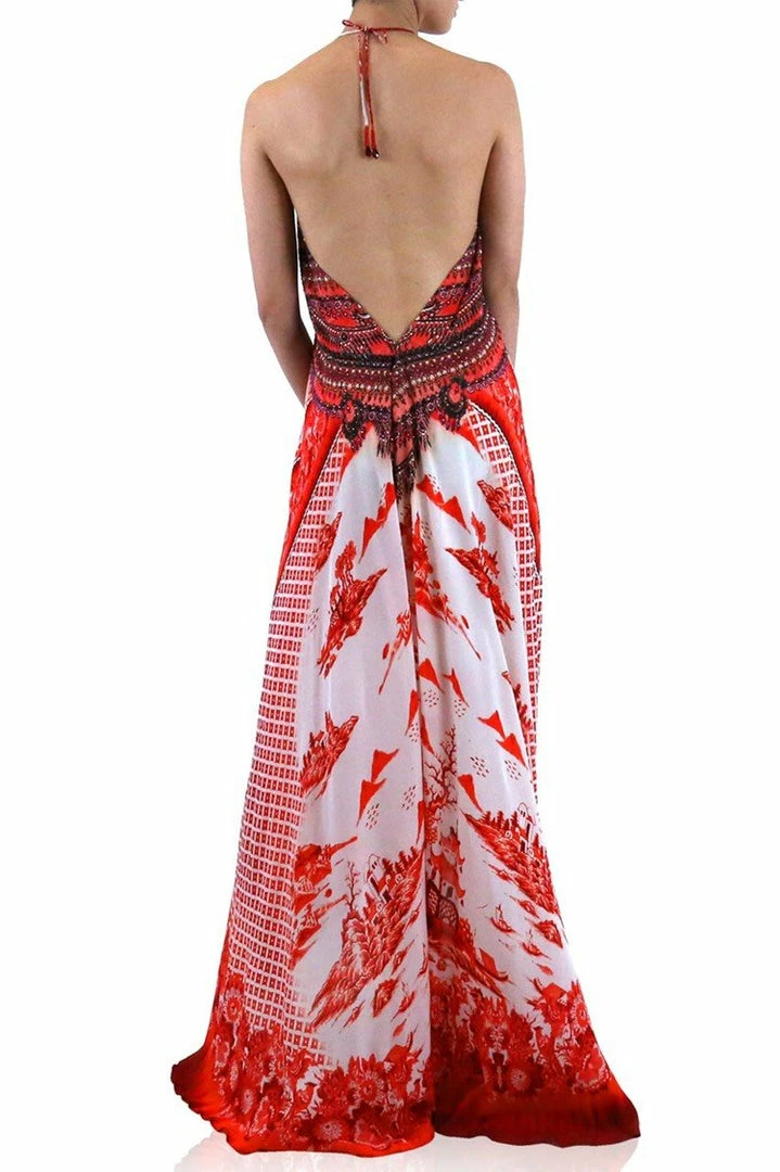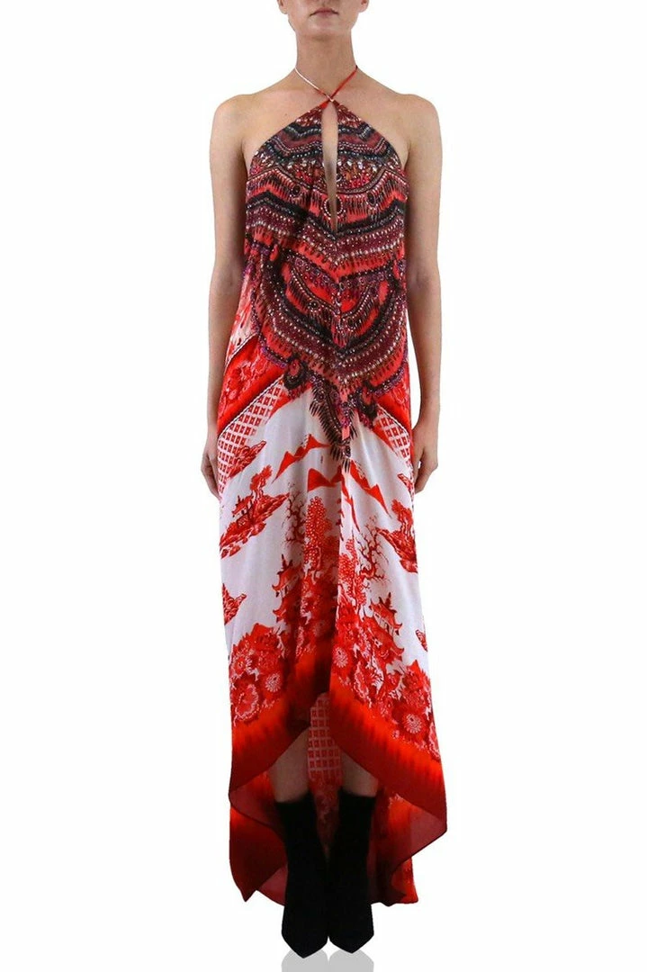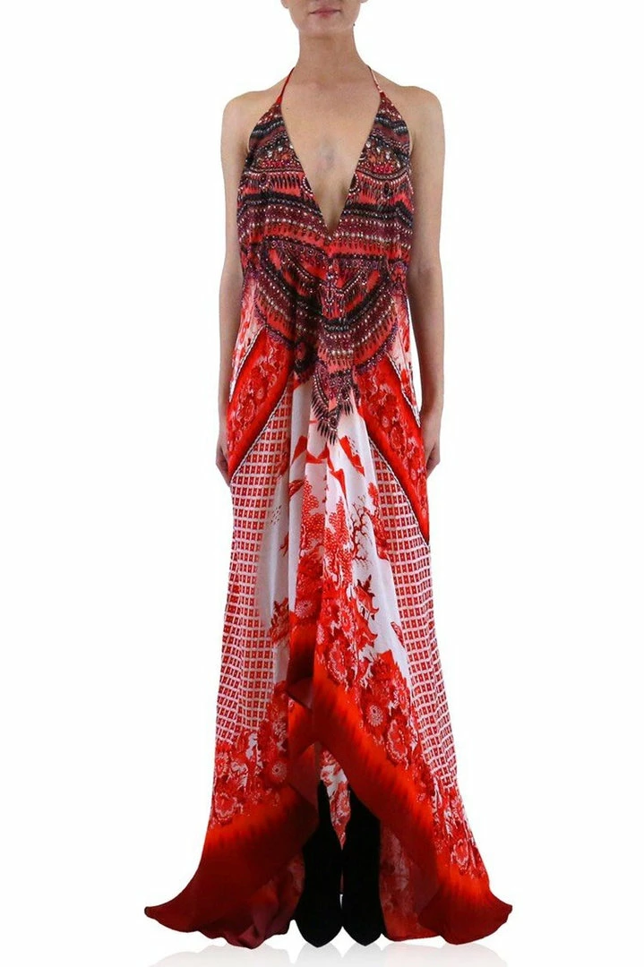One Dress 3 Ways to Style – Can be converted to front crisscross halter-neck, one-shoulder, or deep v-neck with all backless look – Plunging halter v-neck with front adjustable hook-and-eye clasp closure and self-tie at neck – Sleeveless – Low back with hook-and-eye clasp closure to adjust coverage – Removable waist tie fabric belt – Allover mixed print – Designed in USA