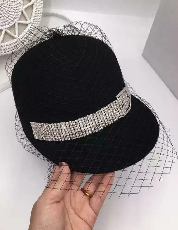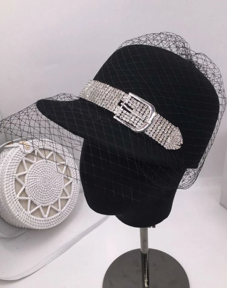 Pair our trendy ‘Charlie’ hat with your all-black outfit to spice up the look. Featuring a rhinestone belted detail and a fishnet overlay.