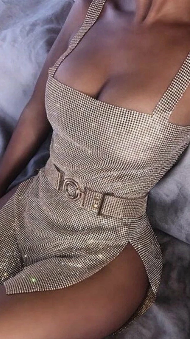 Add some glamour to your next look with this diamond rhinestone dress with matching belt.