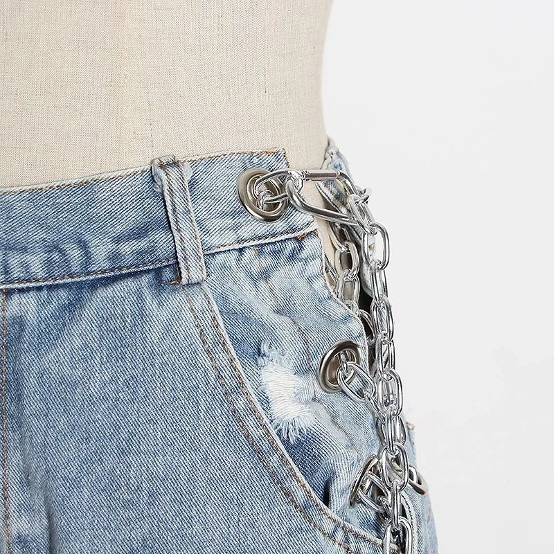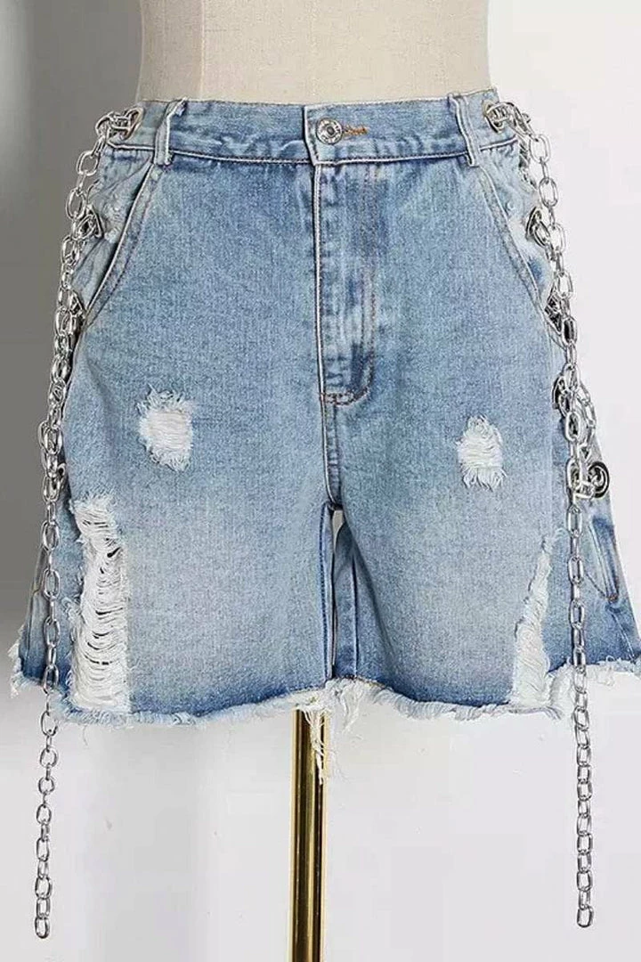 Throw on these shorts when you want an effortless yet so trendy look! Featuring a high-waisted fit, distressed details, chain appliqués, and a button closure. Pair with a white tee and sneakers.
