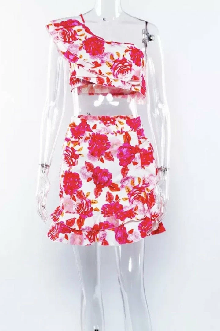 Show off your summer glow in this stunning set. Featuring a floral printed material, one shoulder crop top, and matching high waisted skirt with a ruffle trim. Pair with gold accessories and wedges to complete the look.