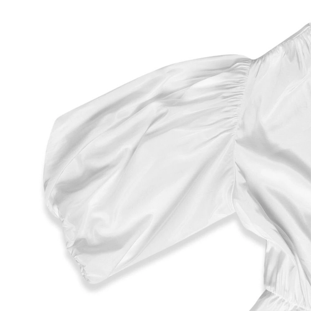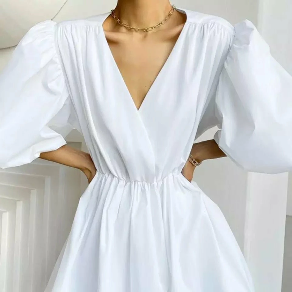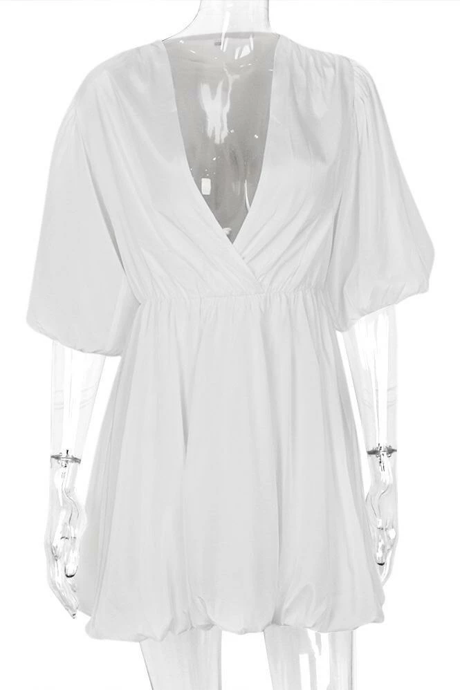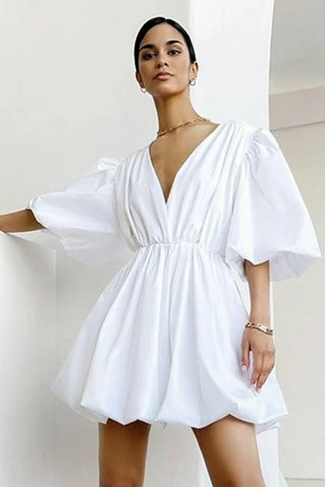 You need this dress for your next all white party. Featuring a puff sleeves, a puff skirt, a slight v neck, and a mini length. Pair with a colored heel and gold jewelry for an adorable look.