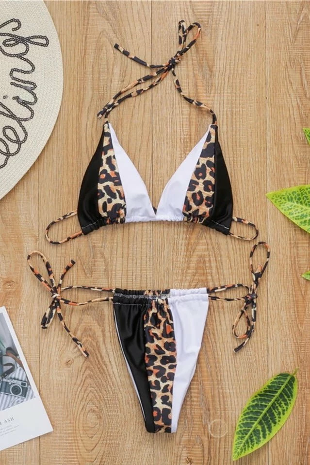 We are loving this wild print for your next pool party! Featuring a leopard print material, colorblock details, halter neck style, and matching string bottoms.
