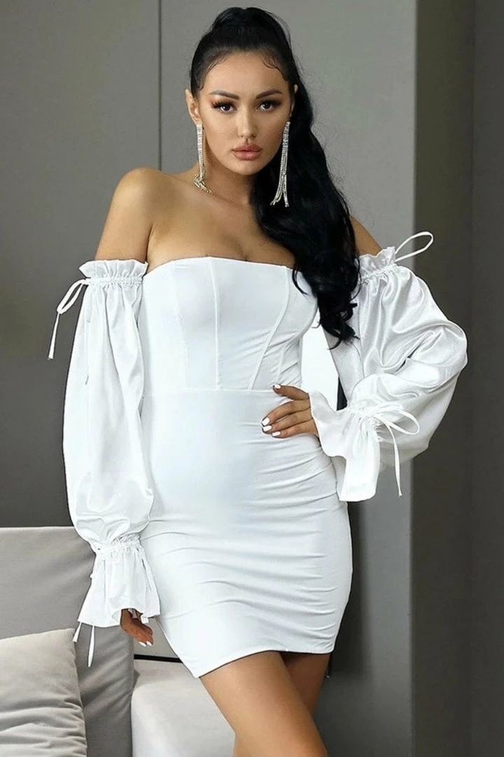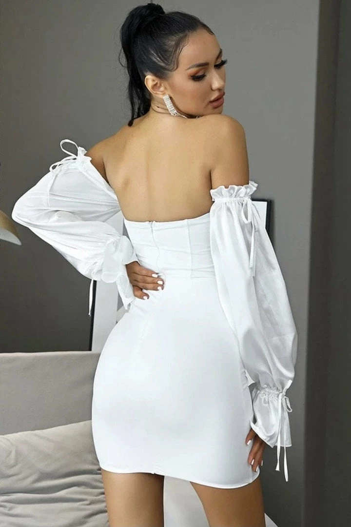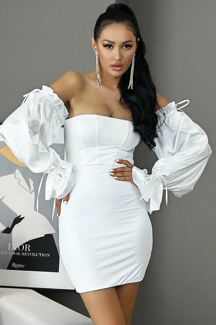 Get this bodycon dress for all occasions! Featuring a white fabric with an off the shoulder design, bowknot details, corset style, and mini length. Team it with some killer heels and kill that saturday night outfit.