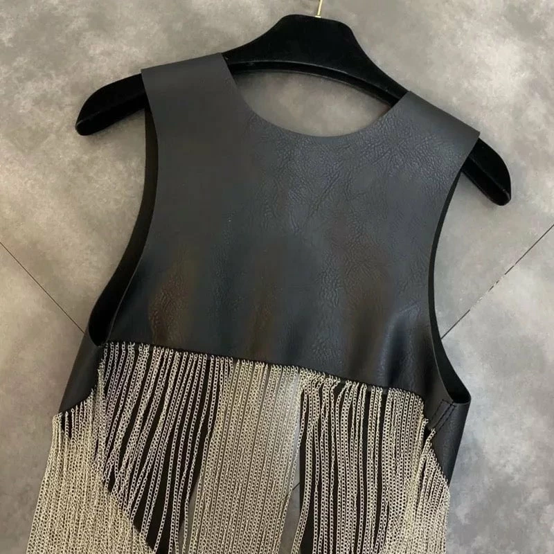 Vests are IN this season dolls! This sleeveless vest top features a faux leather material with silver chain tassel fringes. Team over a sleeveless crop top with high waisted shorts and sunnies for a casual beach bar look.