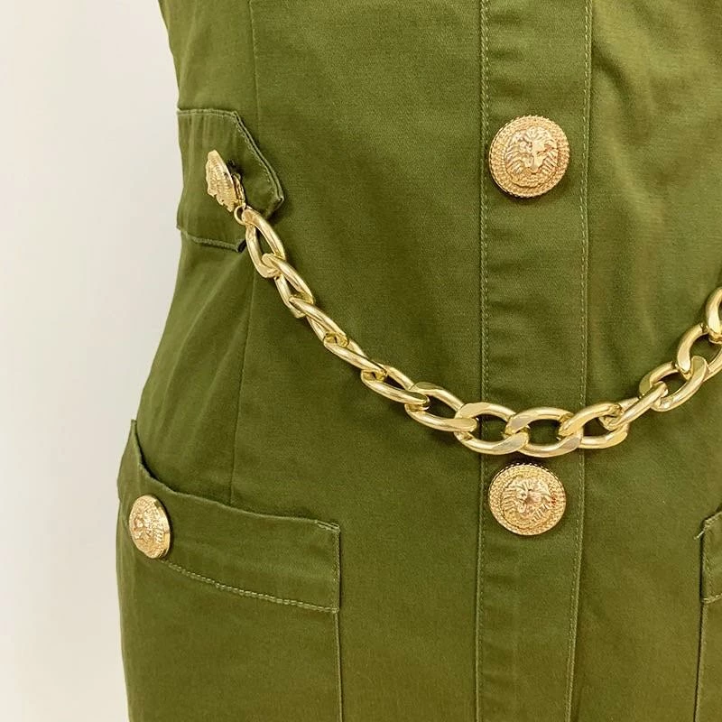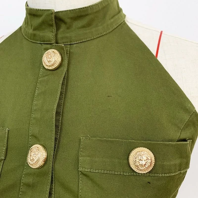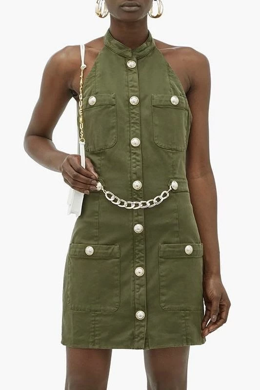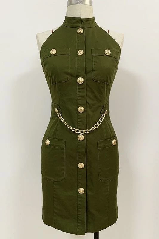 Nail all of the trends this season in this cute mini! Featuring a halter neck style, gold button embellishments, gold belt, high neckline, bodycon fit, and mini length.