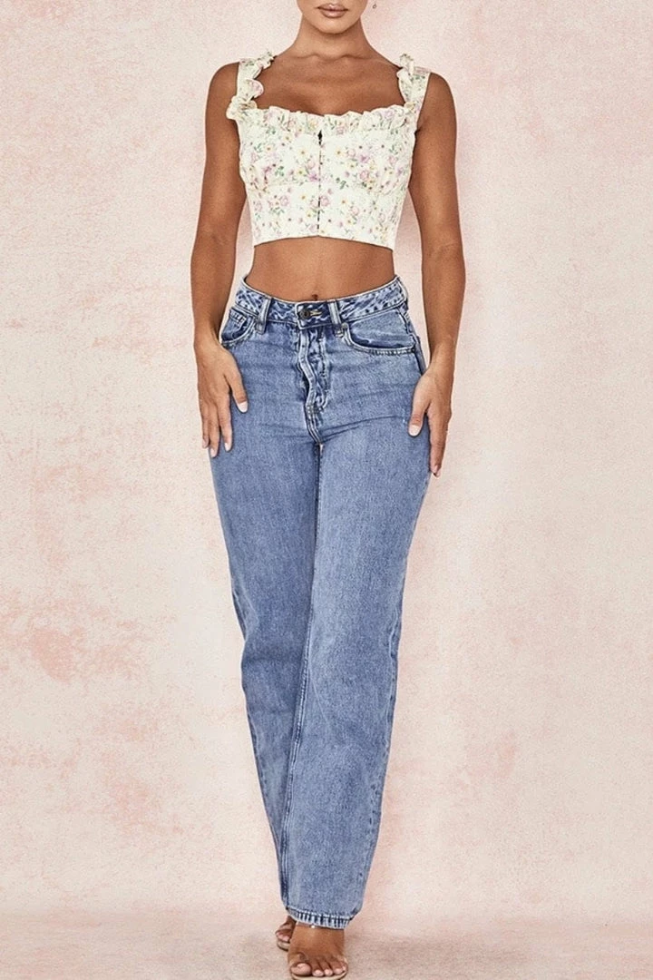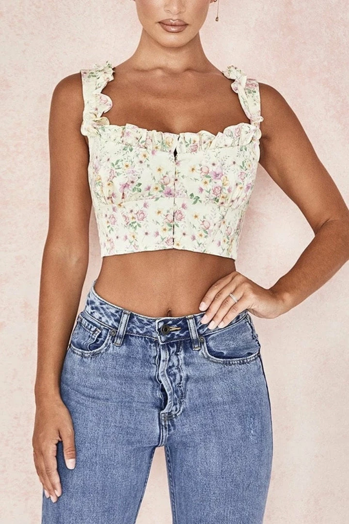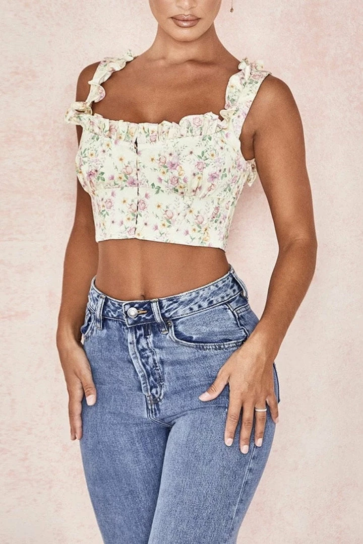 This cute piece features a floral printed material, tank top style, cropped length, and a ruffle detail. Pair with light wash jeans and dainty heels for such a fun look.