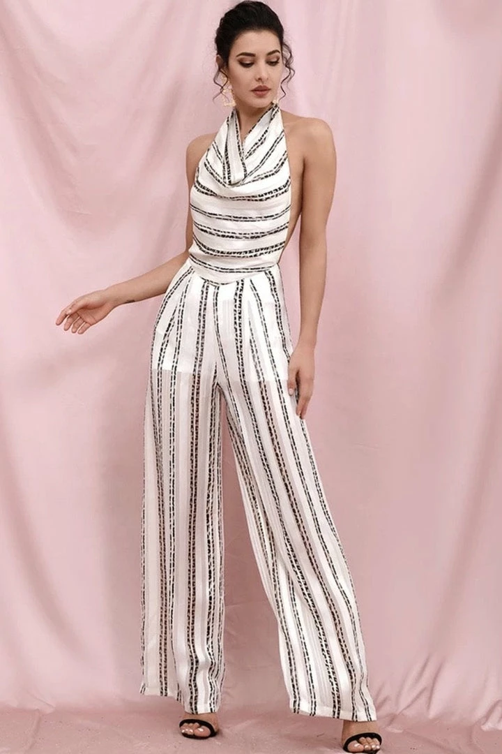 Be the center of attention in this jaw-dropping sexy piece. This jumpsuit features a striped material, cowl neck, backless detail, and a sheer pant with shorts underneath. Pair with stilettos and statement earrings.