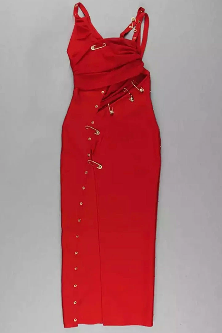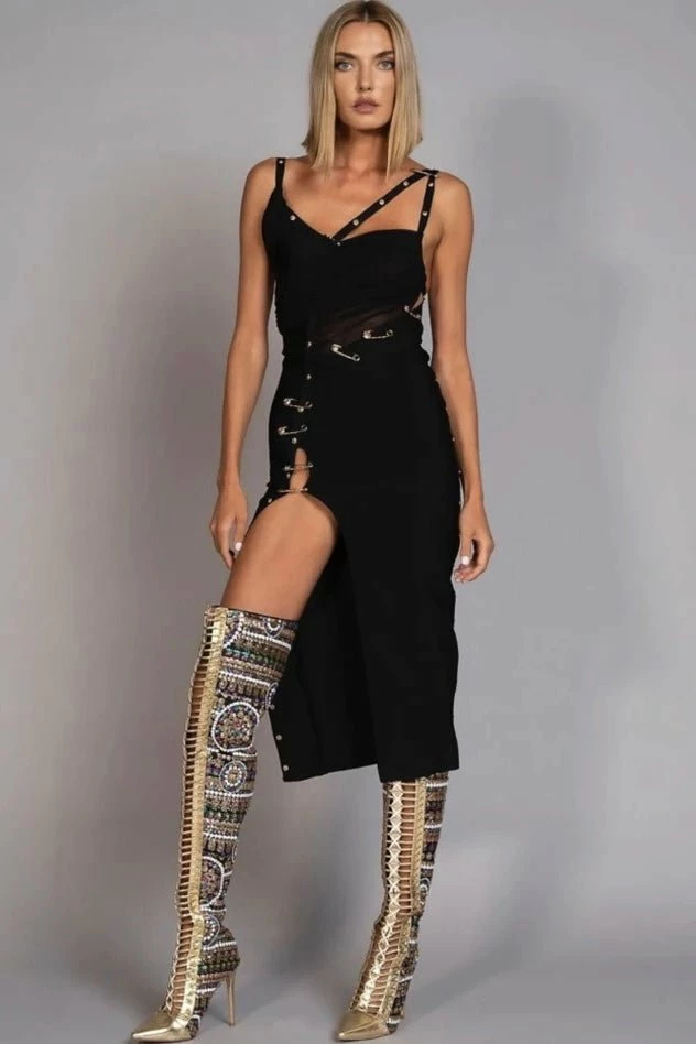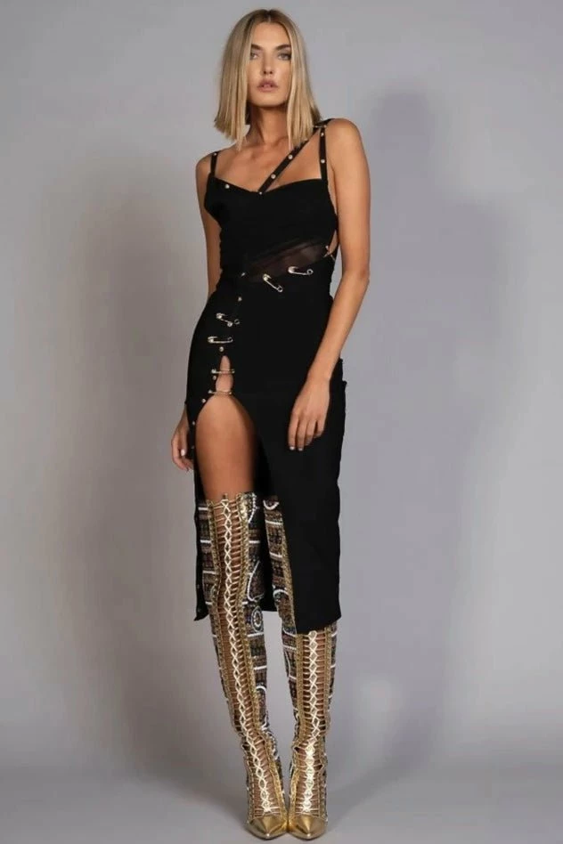 Get this totally unique look for your next dinner date or special event! Featuring a mesh top, bandage bodycon skirt, and safety pin buttoning details. Pull your hair into a pony and pair with hoops, a long strap bag, and clear heels for a look we’re loving!