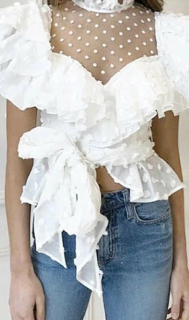 We gotta good thing going on here. This lovely blouse features a chiffon material, polka dot mesh, ruffles, bows, and everything you need for a sassy look. Pair with almost anything like your favorite jeans, a skirt, or leather skirt.