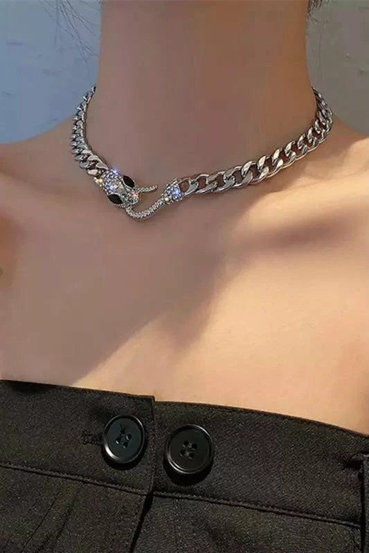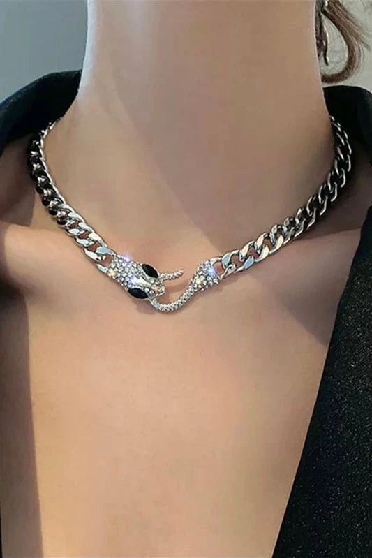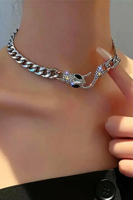 This snake style is so in for the new season. Featuring a silver chain link choker necklace with a crystal detailed snake head and hook enclosure. Layer over other silver necklaces for an eye catching look.
