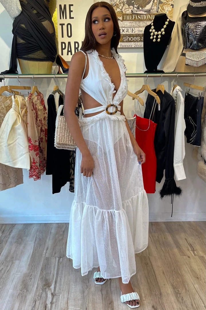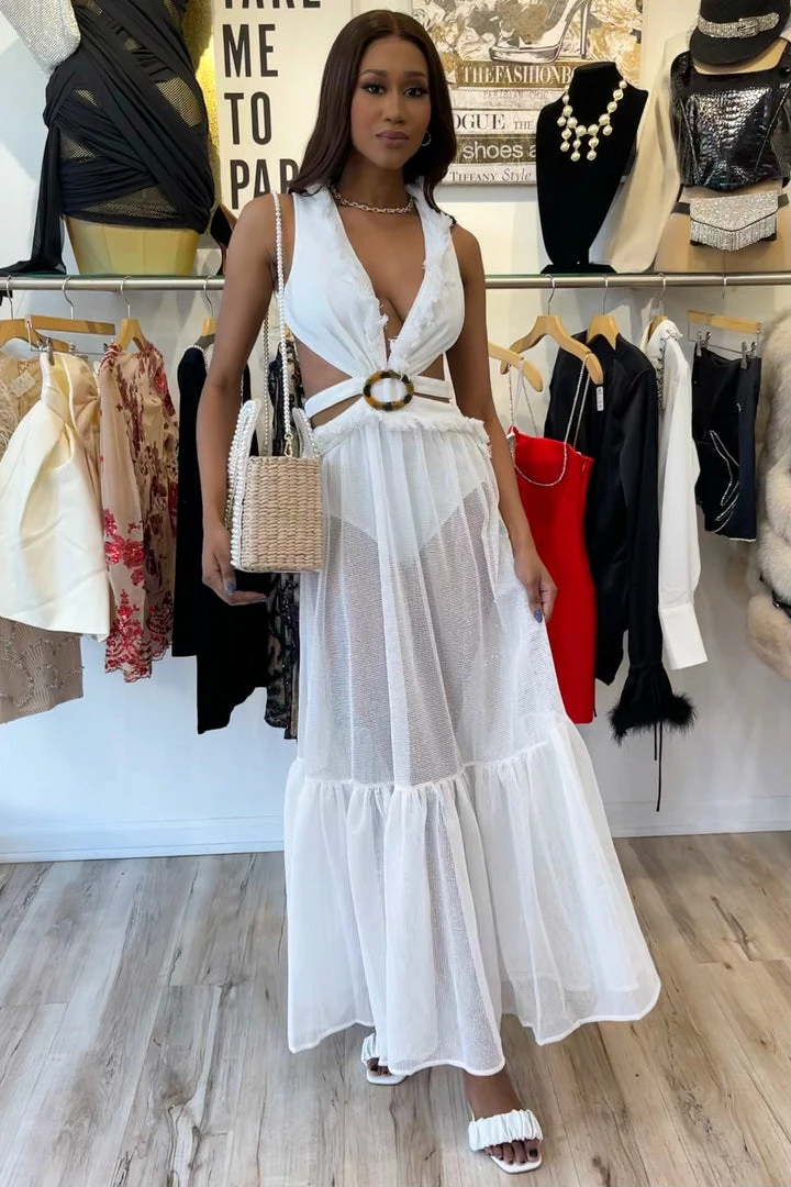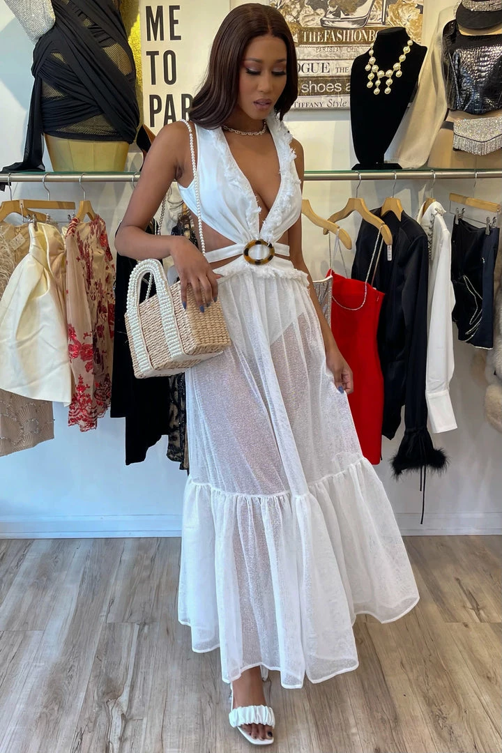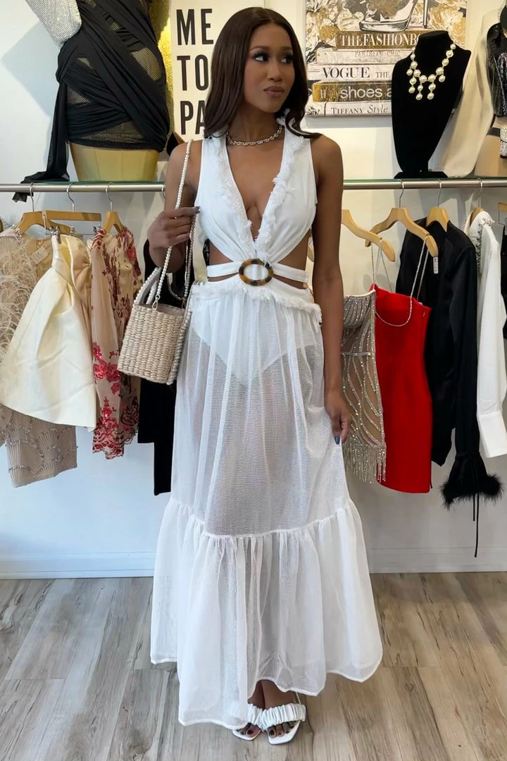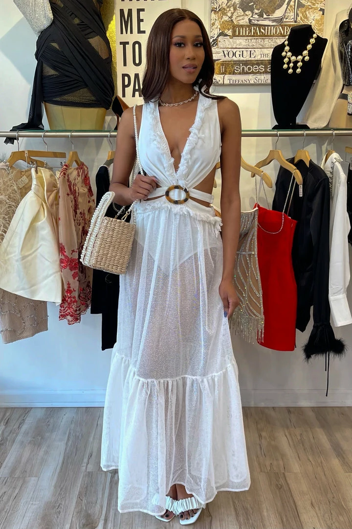 Marigold Halter Waist Cut Out Dress. This fringe cut-out dress features a v-neckline, sleeveless with a fishnet detail, and a lace-up open back.