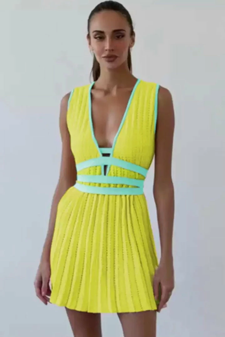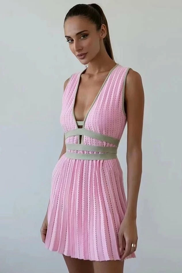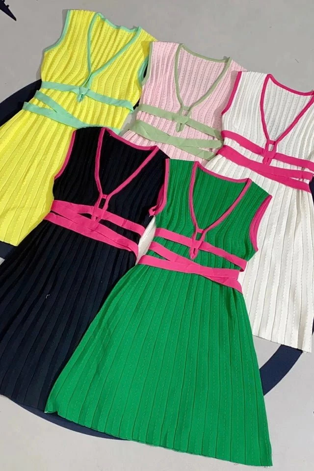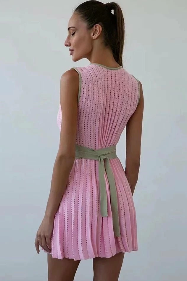 Spring/Summer looks have arrived! This totally adorable mini featuring a sleeveless style, a v neck, fully pleated design, and a strappy waist detail that ties in the back. Style with chunky socks and sneakers with sunglasses for the perfect everyday outfit or for playing tennis with the dolls!