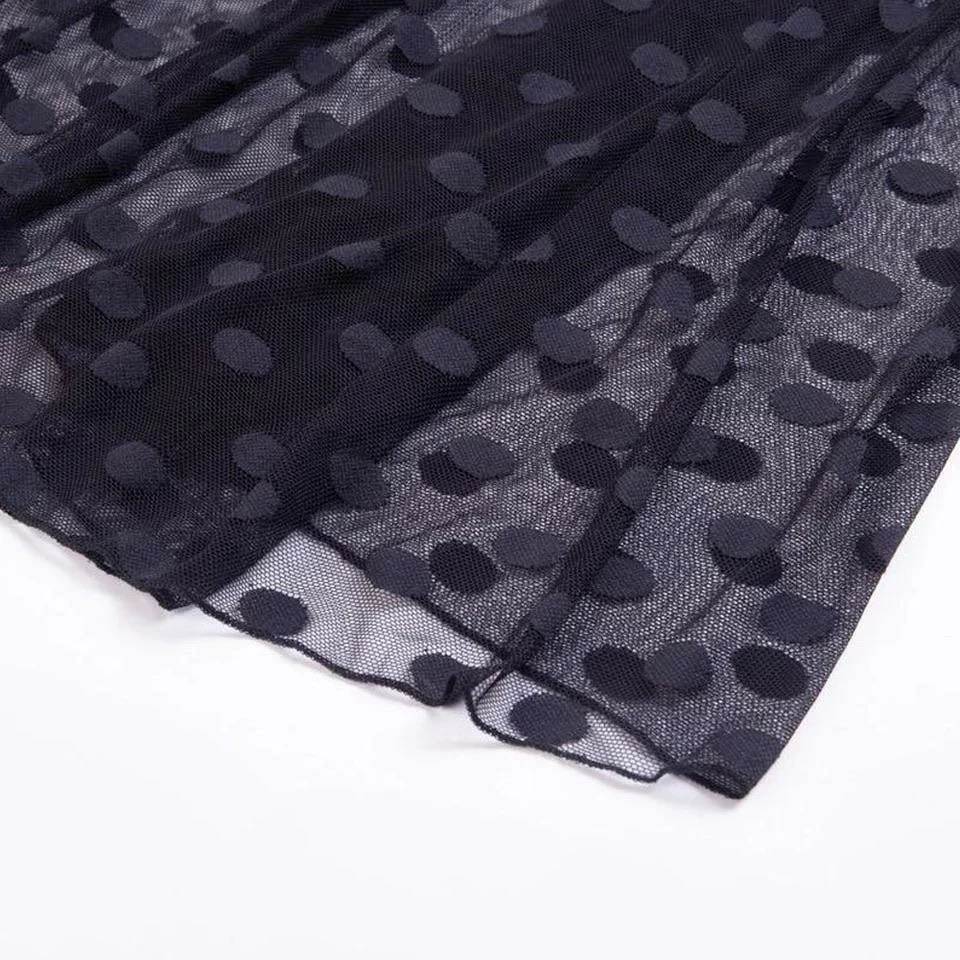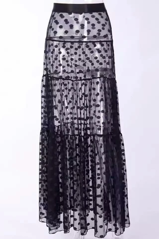 The cutest cover up you need for your warm weather wardrobe! Featuring a high waisted, polka dot design, mesh, maxi skirt. Team this with a matching bikini set and your beach bag for a flirty look!