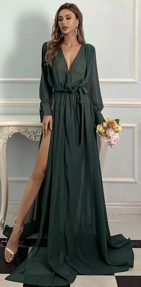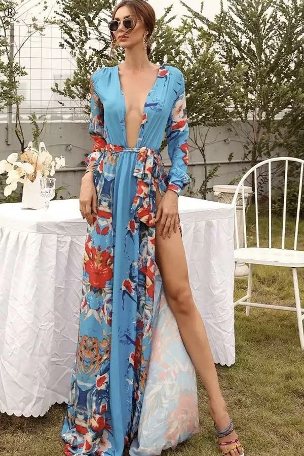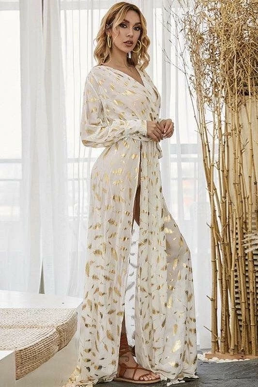 Accentuate your summer glow with this gorgeous maxi! Featuring a gold metallic leaf print, long sleeves, belted waist, and a maxi length. Pair with strappy heels and tousled waves.