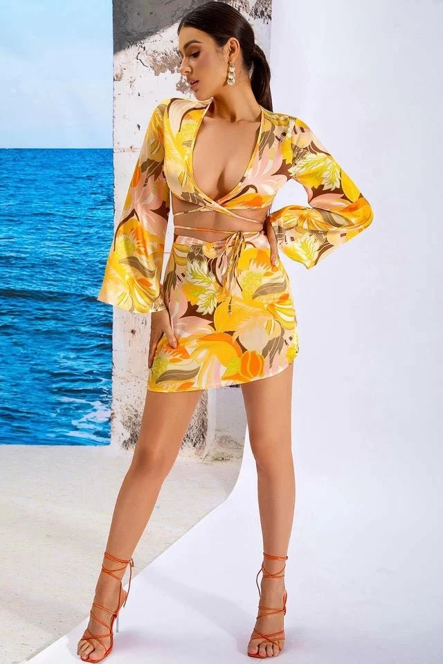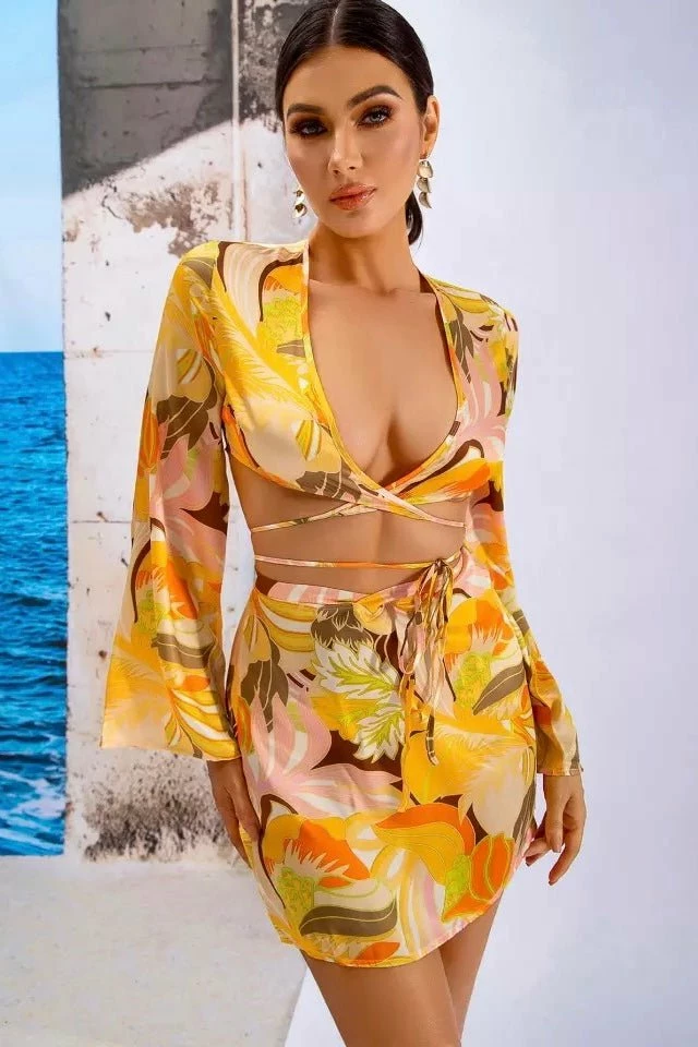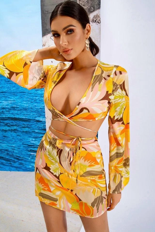 This two piece is at the top of our getaway guide. Featuring a strappy wrap crop top with long trumpet sleeves, a tropical beach print, and a matching high waisted skirt. Pair with bright colored strappy heels and gold jewelry to look vacay ready!