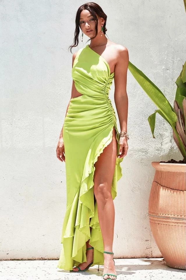 This dress will make you want to dance the night away! Featuring one shoulder, a side cut out, ruched detailing along the opposing side, and a high leg cut out. Pair with ankle strap heels and a clutch to hit your next event in style!