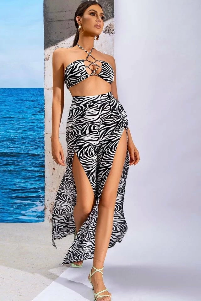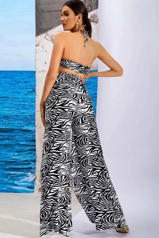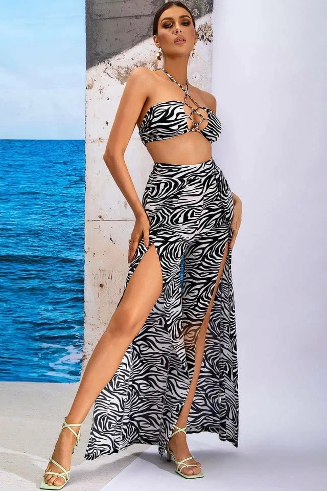 Get wild this season dolls! This summery set features a lace up crop top with a zebra pattern and matching high waisted wide leg pants with slits down the front. Style with black strappy heels and a crossbody for a beach bar look we love.