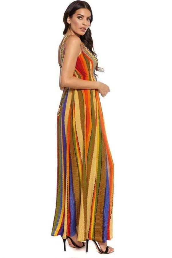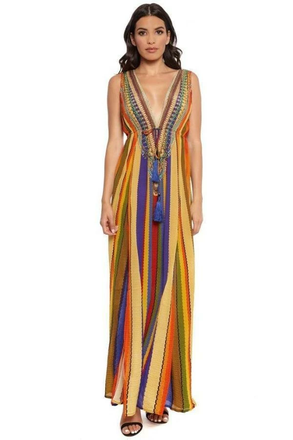 A perfect day to night floor length embellished printed maxi dresses with drawstring v-neckline.