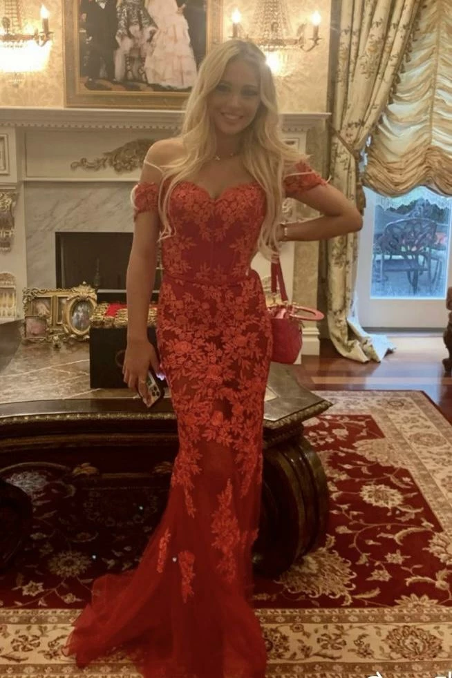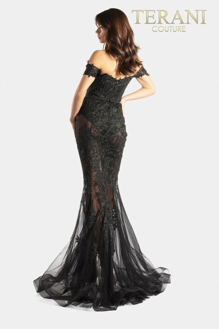 Alluring off the shoulder evening gown with a corseted bodysuit and sheer over skirt. Sheer mermaid prom gown appliqued with sultry lace. The skirt is styled in tulle which flares to a full length hemline, highlighting a mermaid silhouette. Features an off the shoulder style and a polyester material.
