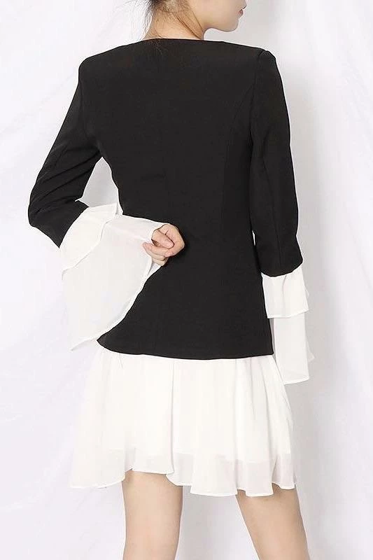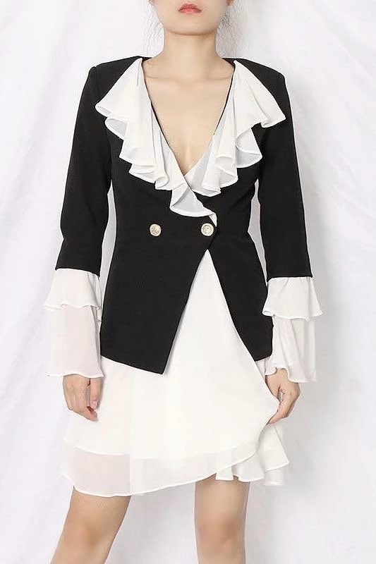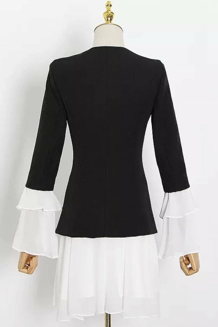 This blazer style dress features long sleeves, ruffle details, gold button embellishments, flared sleeves, and a mini length.