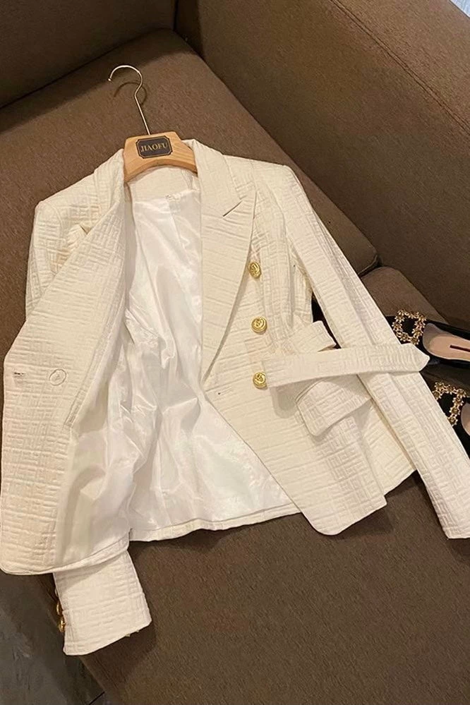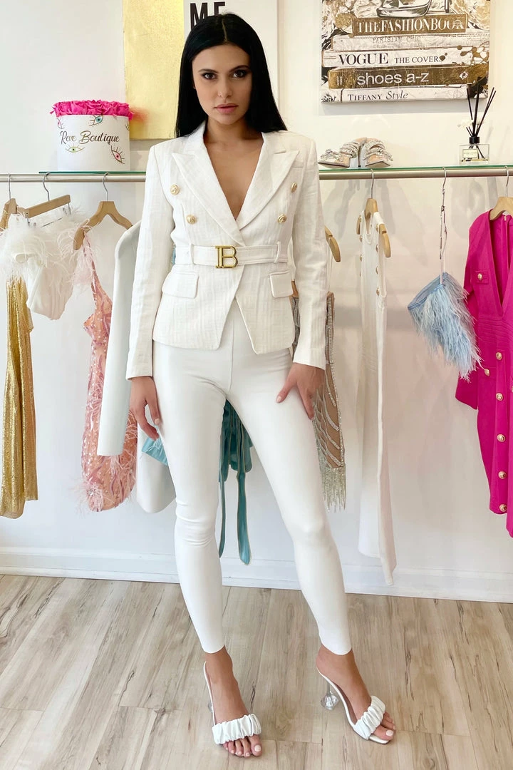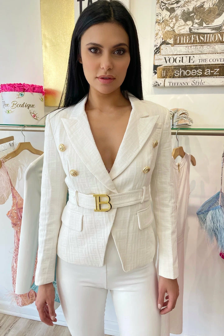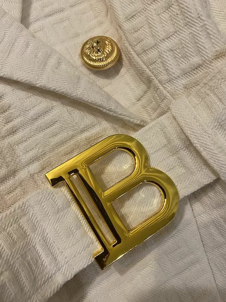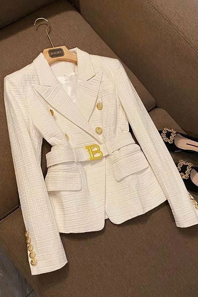 Update your office wardrobe with this perfectly preppy blazer! Featuring a double breasted style, long sleeves, gold button detailing along the breast and cuffs, and a detachable belt with a B embellishment for a high fashion look. Team with straight leg pants, a sneaker or heel, and old jewelry for a look thats giving us boss babe energy!