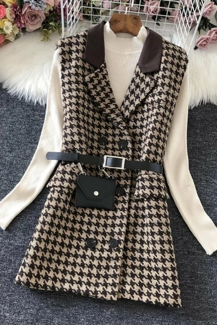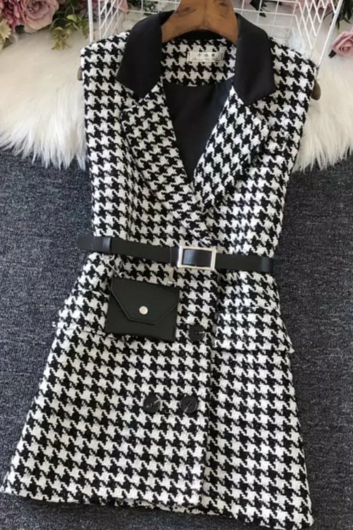 Look elegant yet stylish in this cute blazer! Featuring a houndstooth material, sleeveless style, belted waist and coin purse detail, Pair with a turtleneck underneath and booties for a fabulous look.