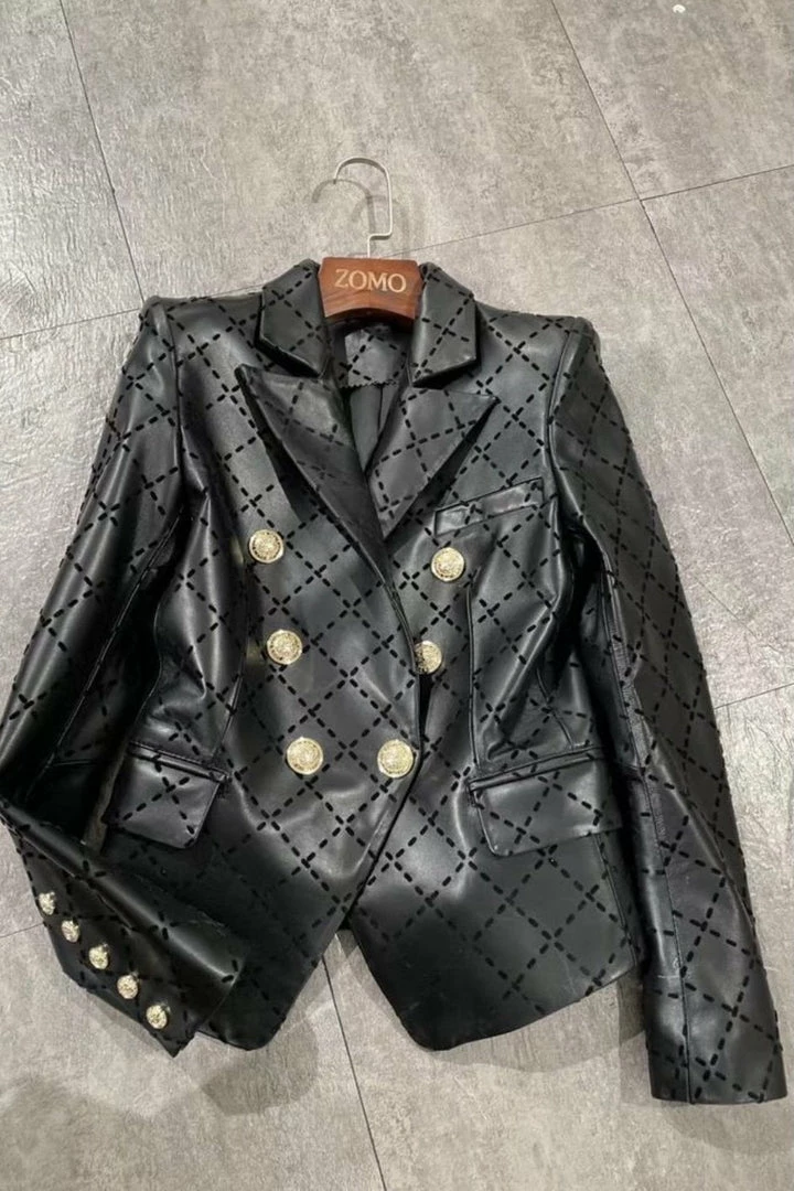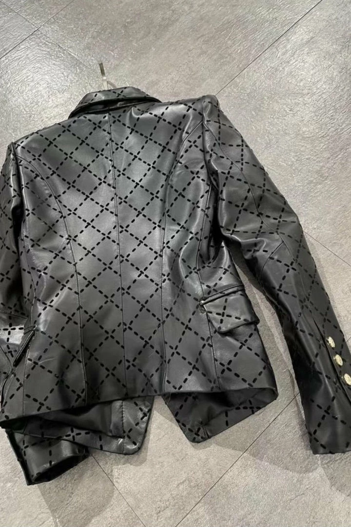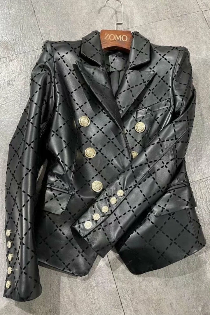 This black leather blazer is complete with detailed gold buttons, and a black sheepskin check pattern throughout. This unique combo of textures lets you wear this blazer with any all black outfit to immediately elevate it!