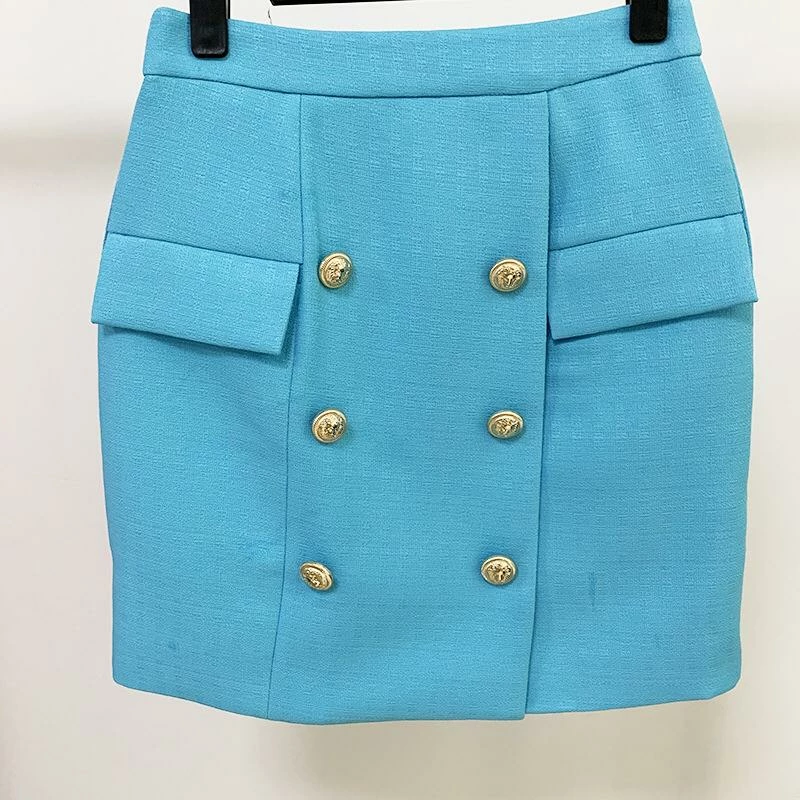 Featuring a mini skirt with two fake pockets, gold buttons, and a back zipper fasten. Pair with the matching blazer or with a white bodysuit and mini heels for a professionally chic look!