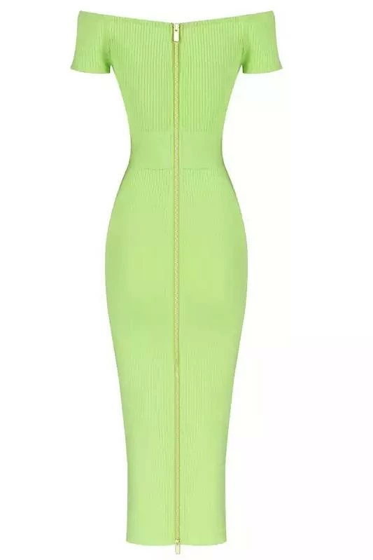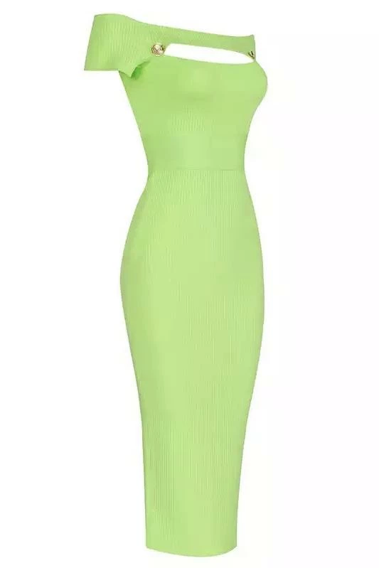 This classy bodycon dress features an off the shoulder style, an above the breast cut out, and a mid calf length. Pair with open toe, ankle strap heels and head to the office looking fabulous!