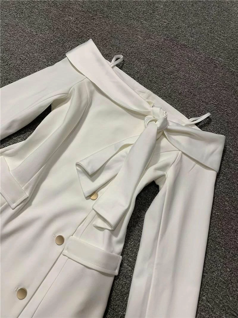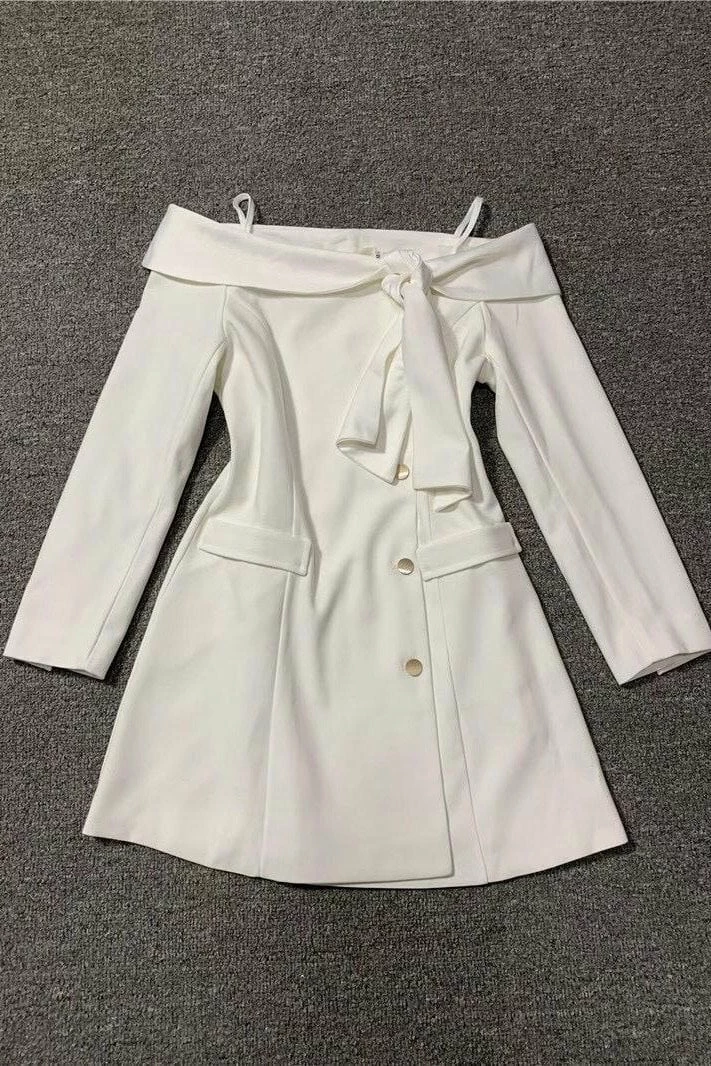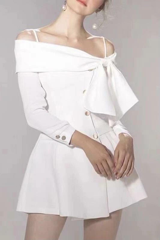 This mini dress screams spring elegance. Featuring an off-centered, gold button down, off the shoulder style, long sleeves, and a draping knotted sash. Pair with long earrings, a crossbody bag, and barley there heels for a chic look.