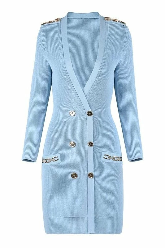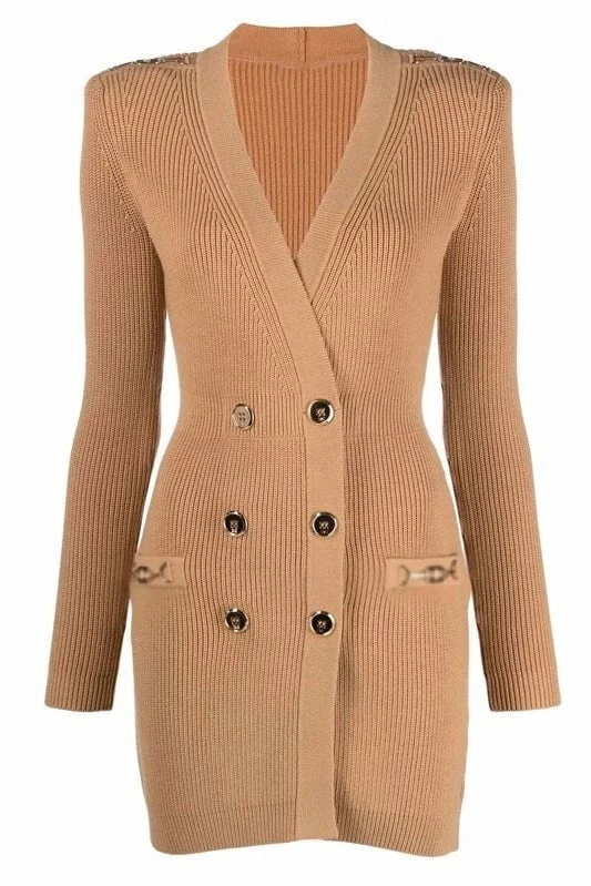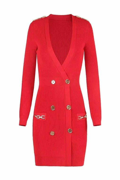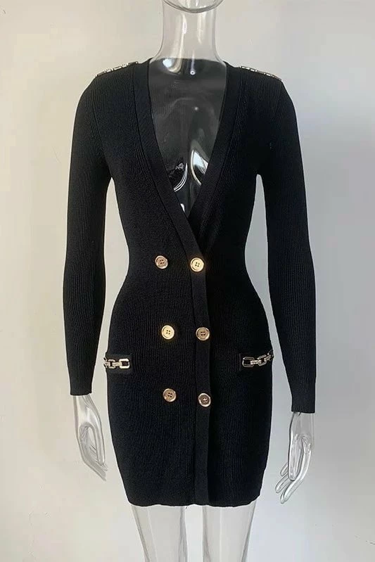 Go comfortable chic in this mini dress we’re loving! Featuring a long sleeve mini dress with a v neck, knitted material, and gold button and chain detailing. Pair with your gold jewelry and your favorite pumps!
