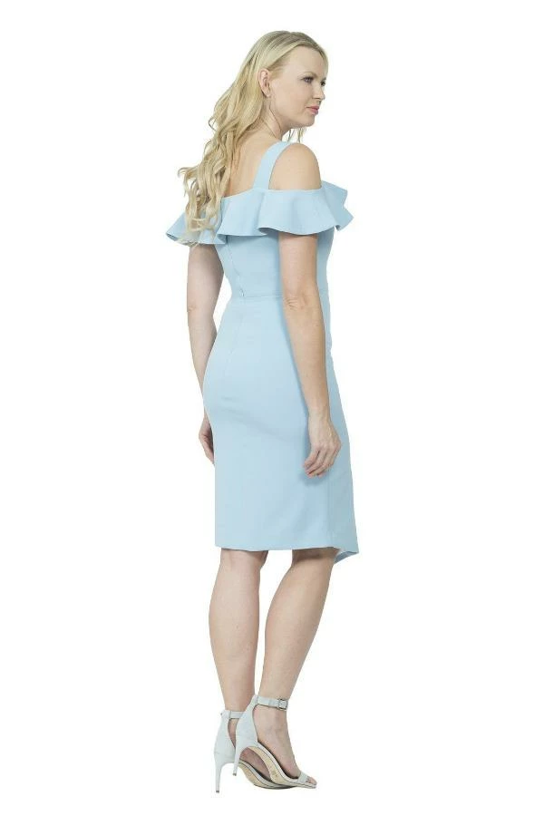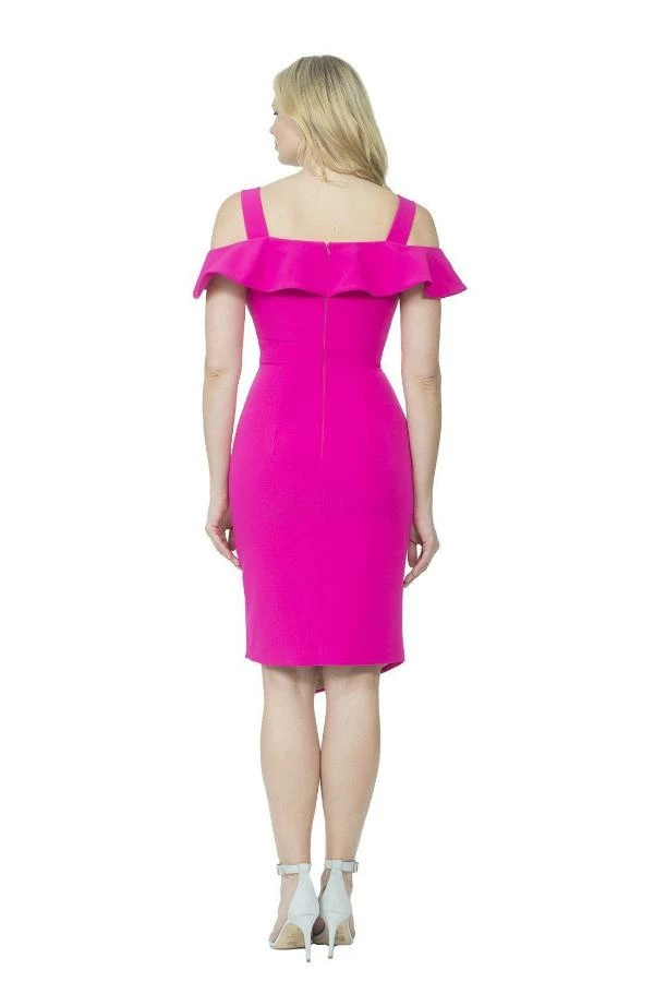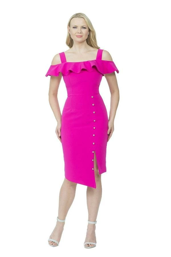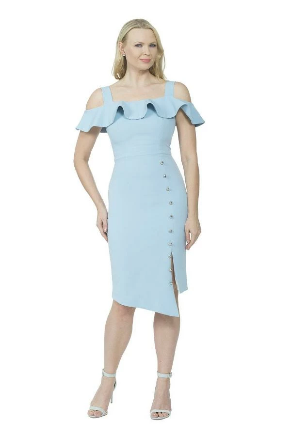 Cocktail dress with ruffle detail, a side slit and embellishments going down one side.