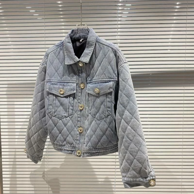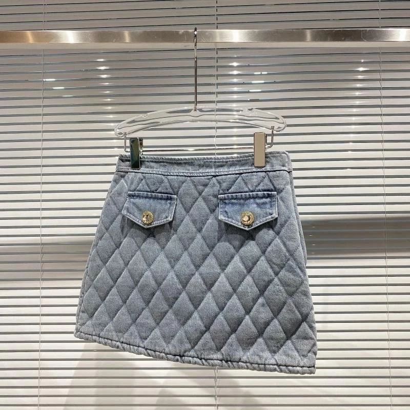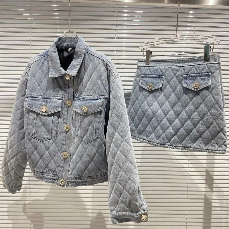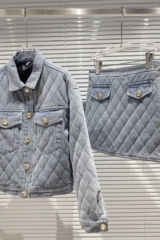 Fight the chilly spring weather with this adorable two piece set featuring a long sleeve, quilted, denim bomber and a matching high waisted skirt with double pockets. Wear them together with a bodysuit and high knees boots or gladiator sandals.