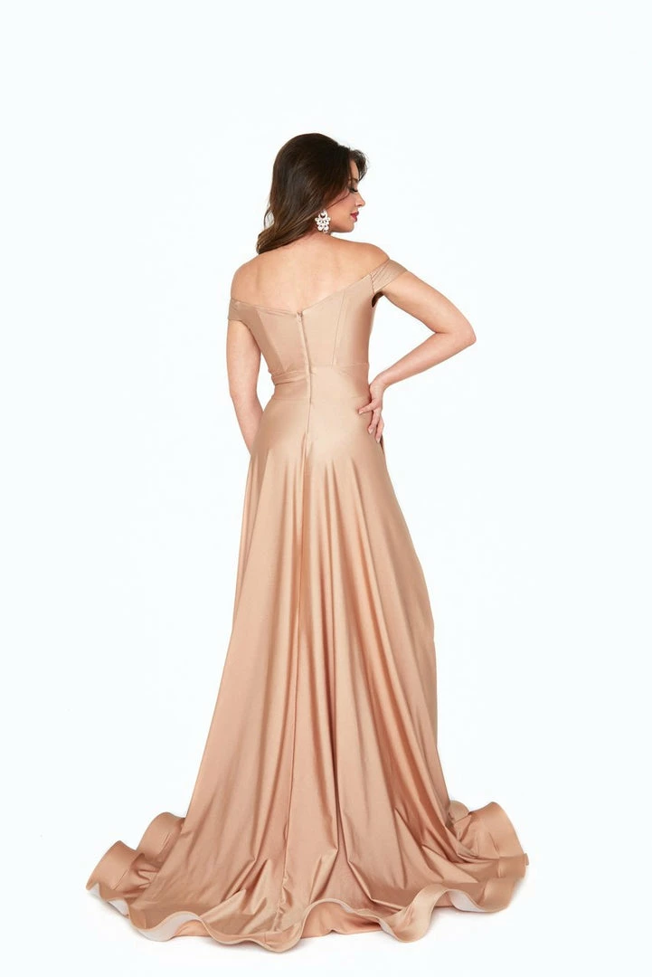 This style is an off the shoulder a-line design. The sweet heart neck-line and slit will make you feel like a queen. The design is anything but simple as this makes you look sophisticated and classy.