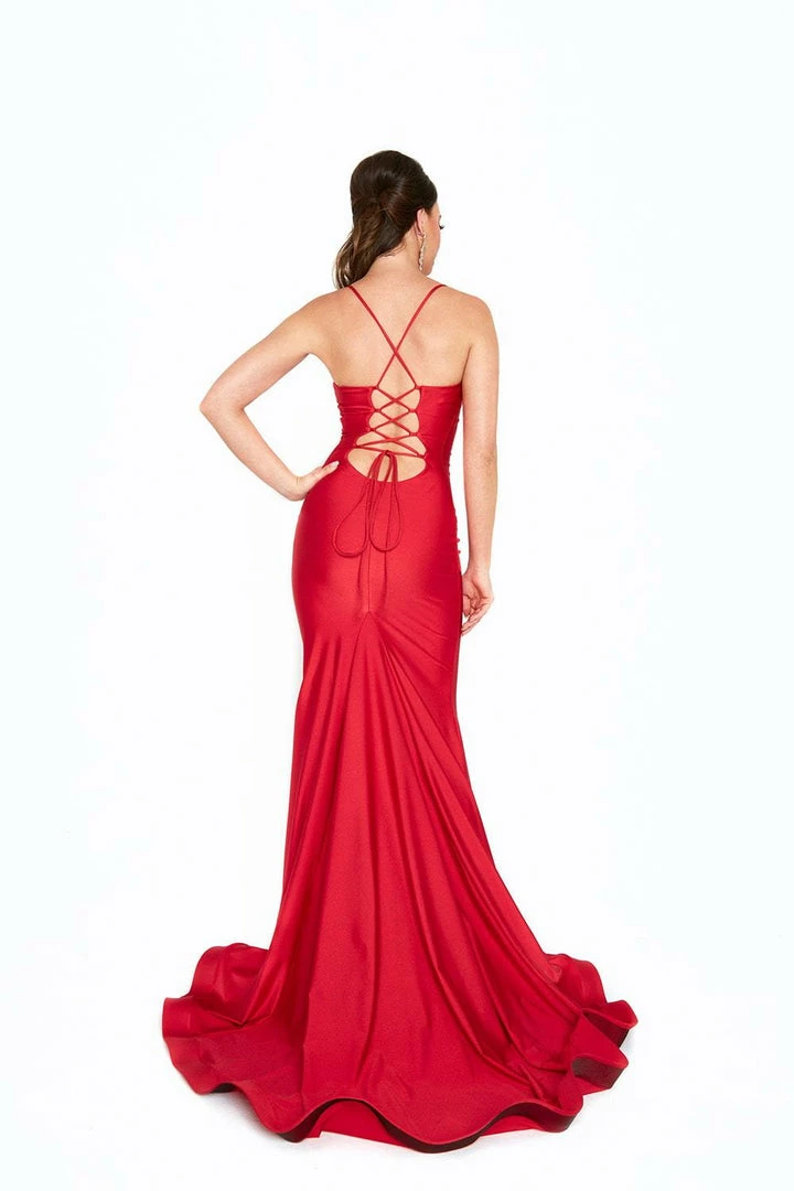 This gown is a simple style with a straight cut neckline and a beautiful lace up back which allows for your figure to come through and be shown off!