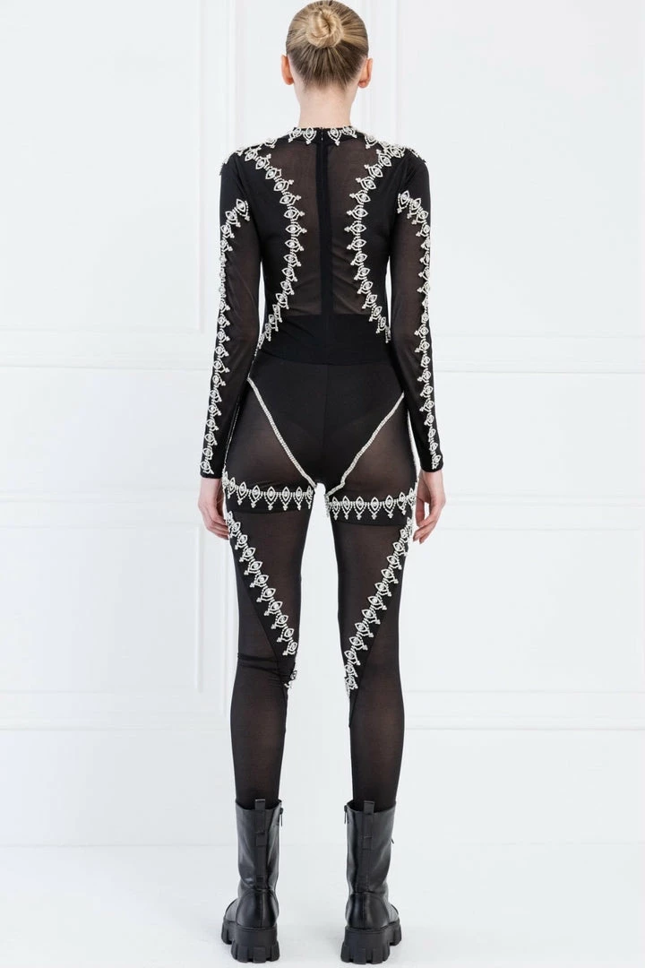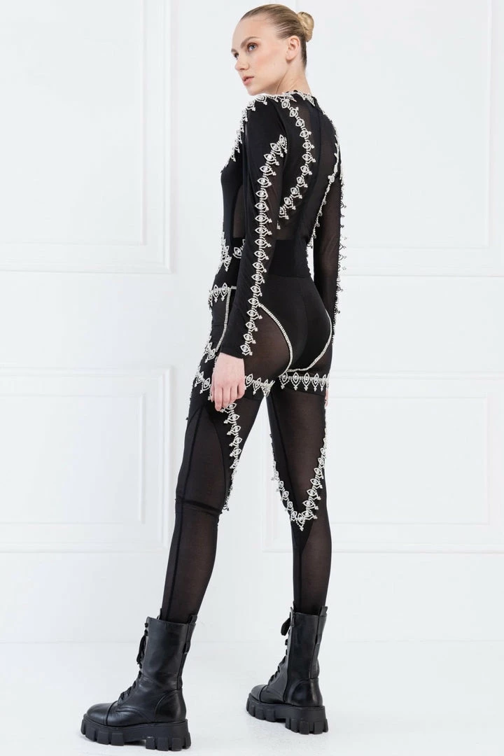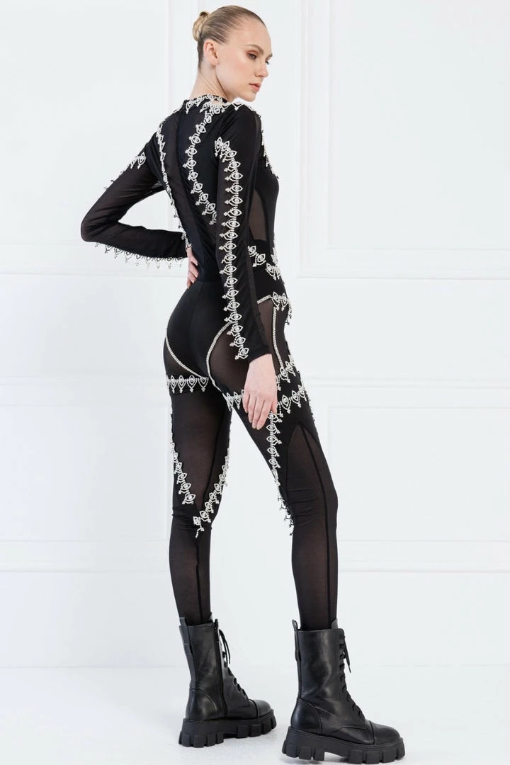 It’s statement season dolls and we’re coming in hot! This mesh jumpsuit features, long sleeves, a swoop neckline, and rhinestone detailing throughout. Perfect for your next themed party or dazzling event!