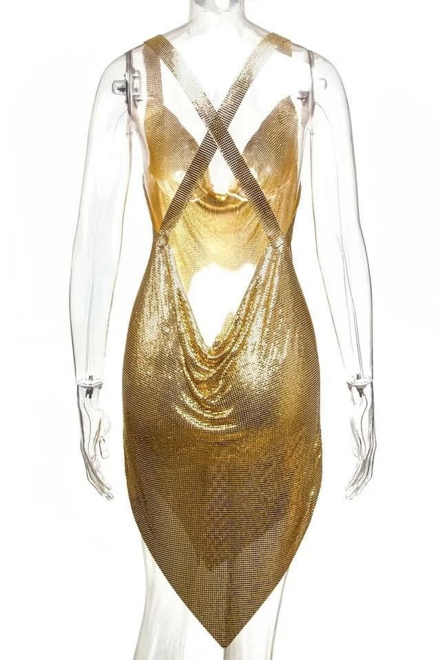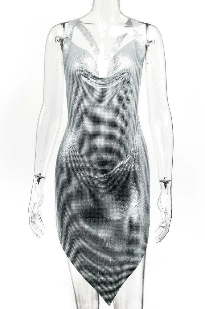 Give em glitter! This stunning dress features a cowl neck, rhinestone material, strappy open back, and an irregular hem. Pair with ankle strap heels and matching necklaces for the hottest look in the club!