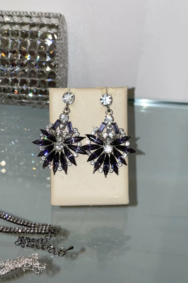 These dangle earrings scream luxury. Featuring a purple flower crystal design, diamond studs, a chandelier style, and stud backings. Wear with a sleeveless gown to elevate your nighttime attire.