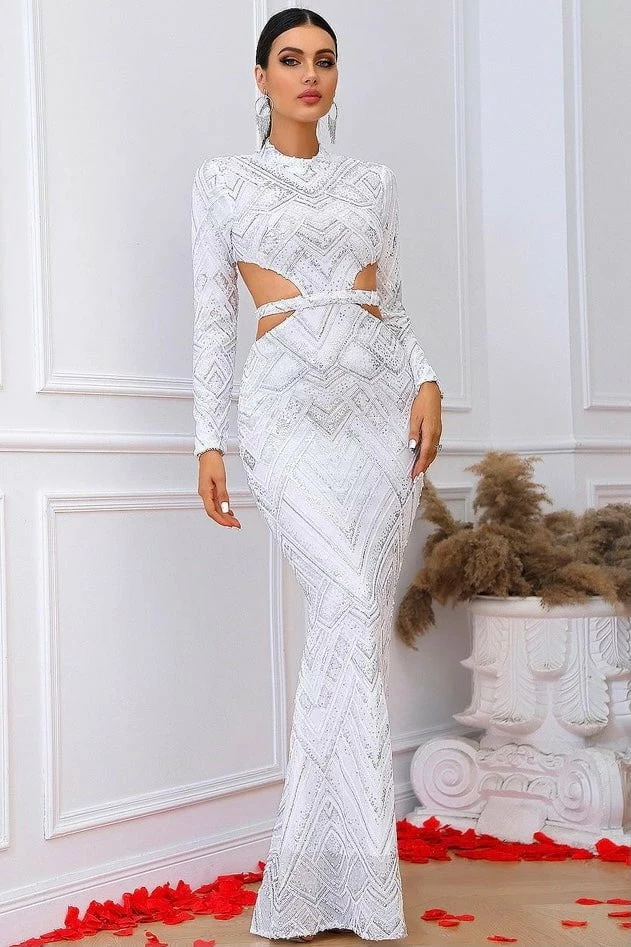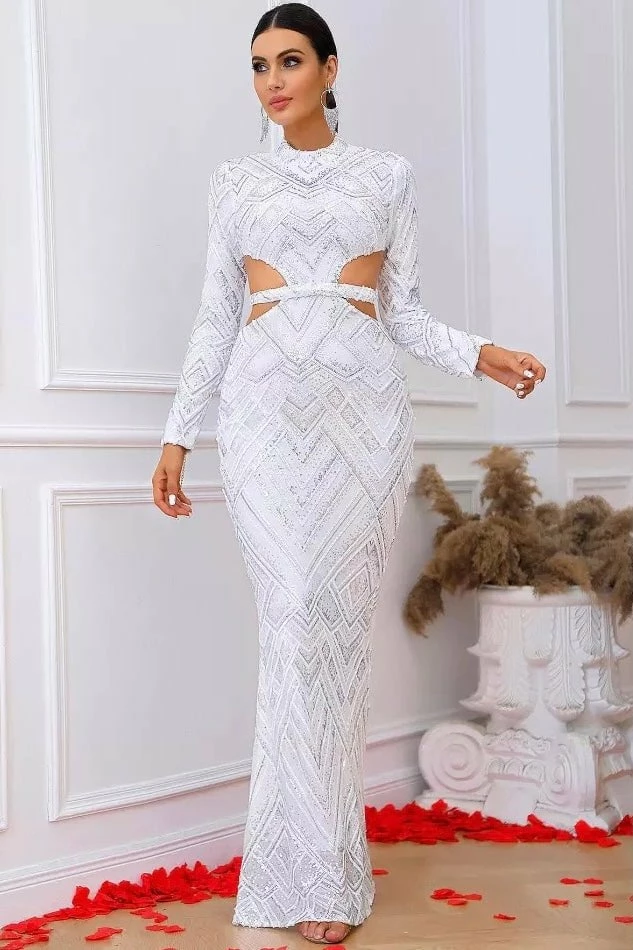 Step into your event with an outfit that will make their eyes pop! This long sleeve gown features block shoulders, a high neckline, cut out sides and back, and a geometric, fully sequin design. Pair with simple pumps and a clutch to bring elegance into every room.
