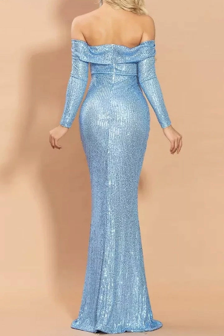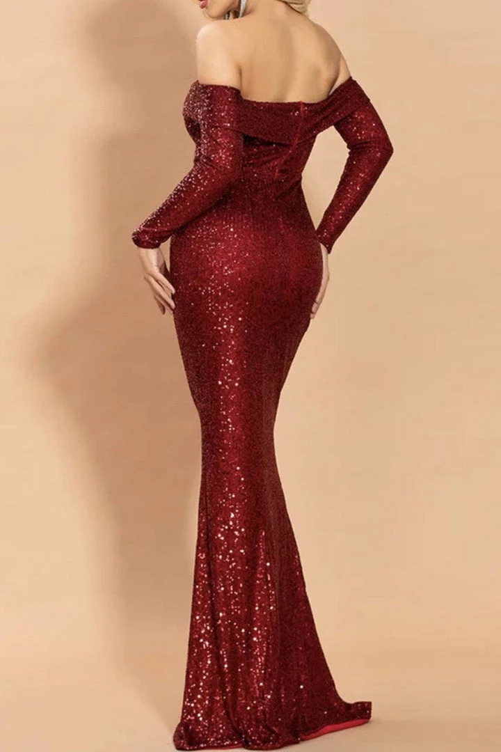 Look stunning from every angle in our ‘Jackie’ gown! Featuring a sequin material, off the shoulder style, long sleeves, bodycon fit, and floor length. Pair with statement earrings and a sleek ponytail!