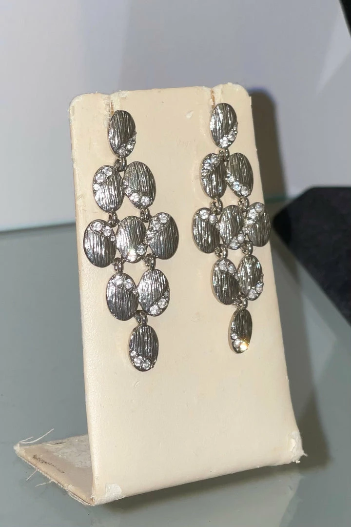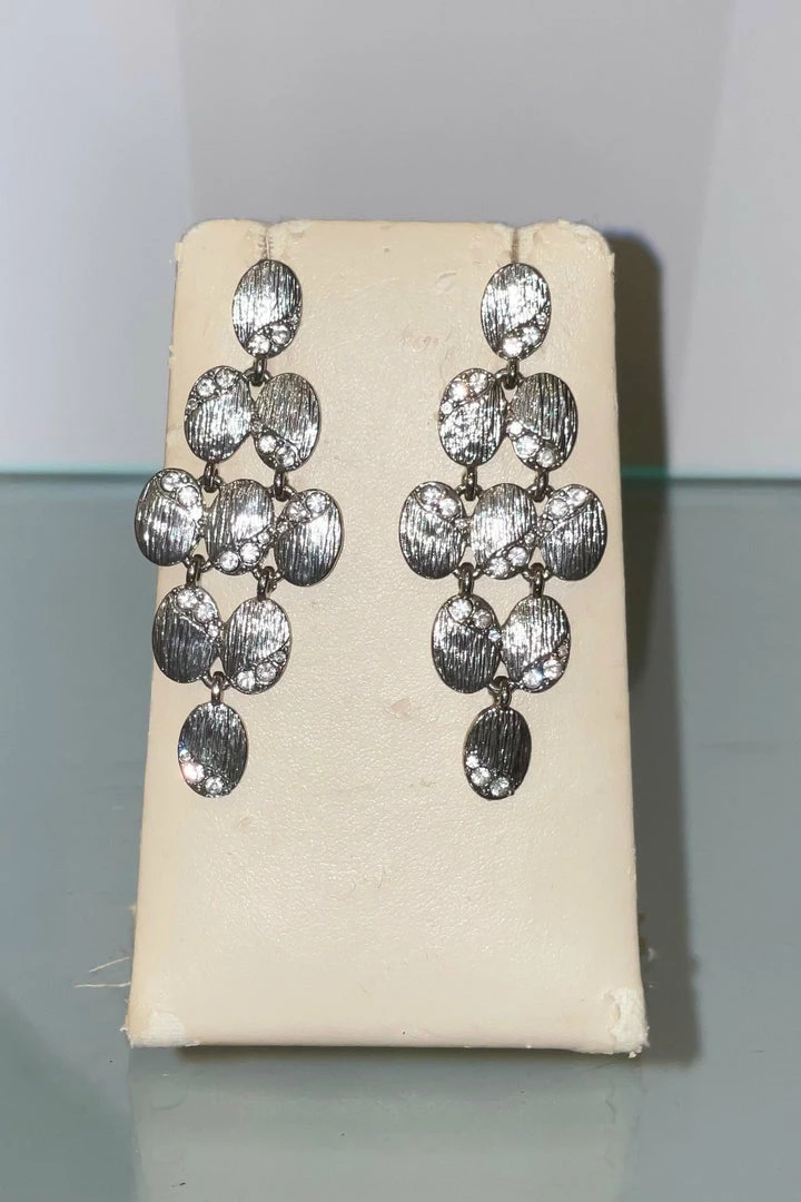 A stunning addition to any event. These classic earrings feature cascading silver plates with diamonds carved throughout and stud backings.