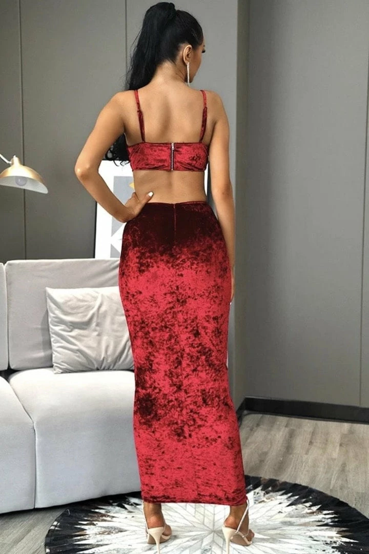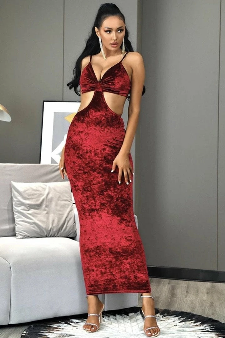 Catch all the stares at your next holiday event in this stunning maxi. Featuring a velvet material, cut out details, v-neck style, bodycon fit, and a maxi length. Pair with silver accessories and a matching red lip!