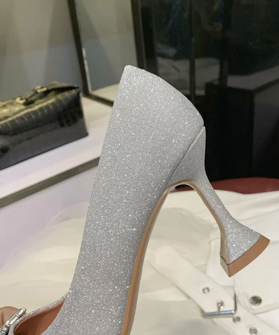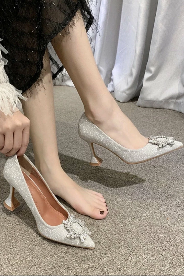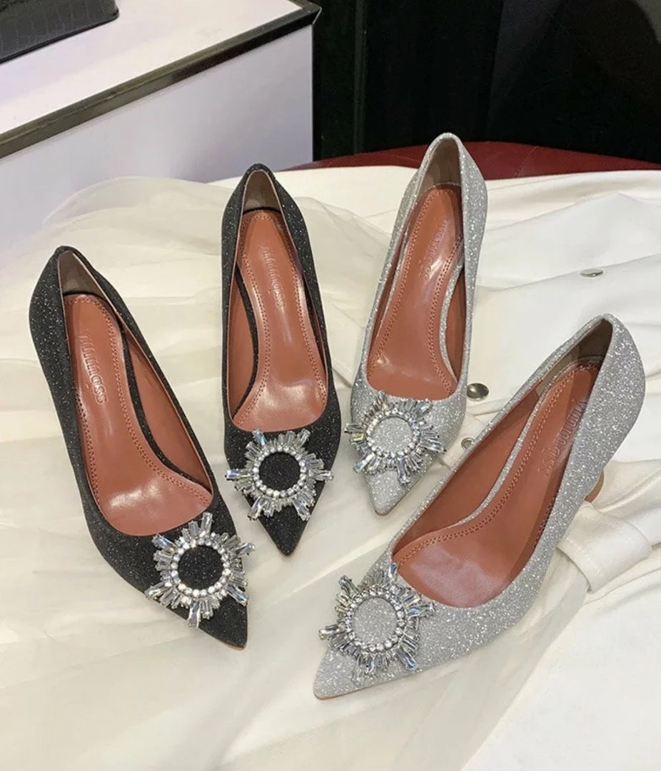 Look absolutely elegant yet on trend with these stunning pumps. Featuring a glitter material, pointed toe, and diamond appliqué.